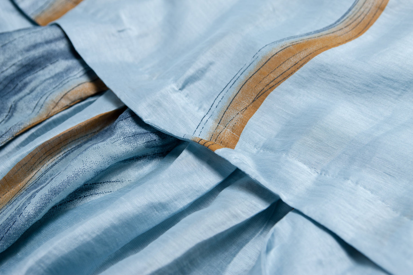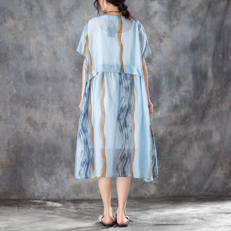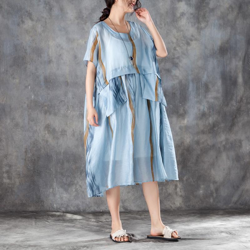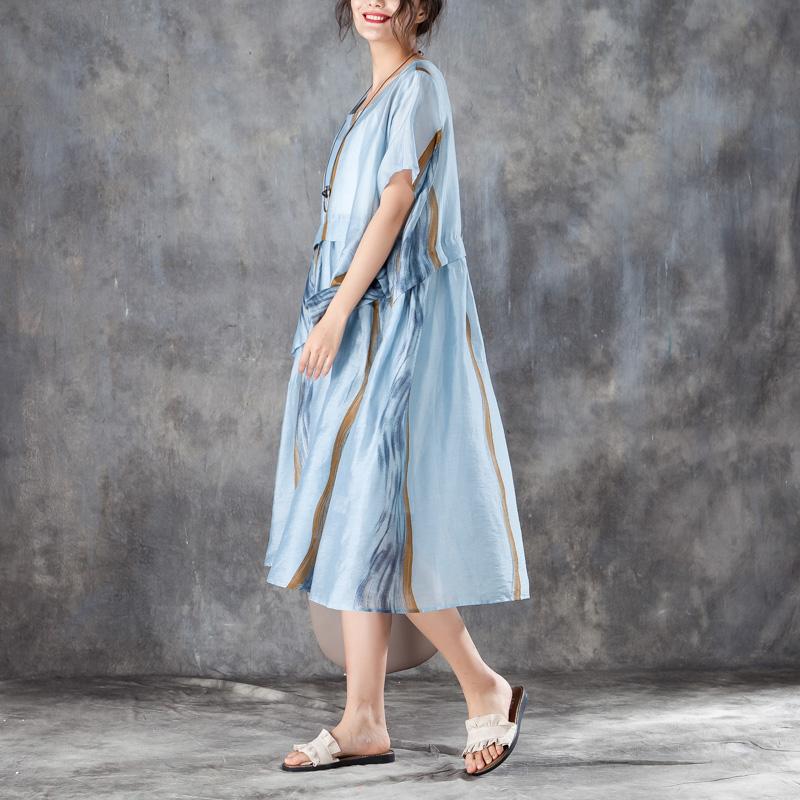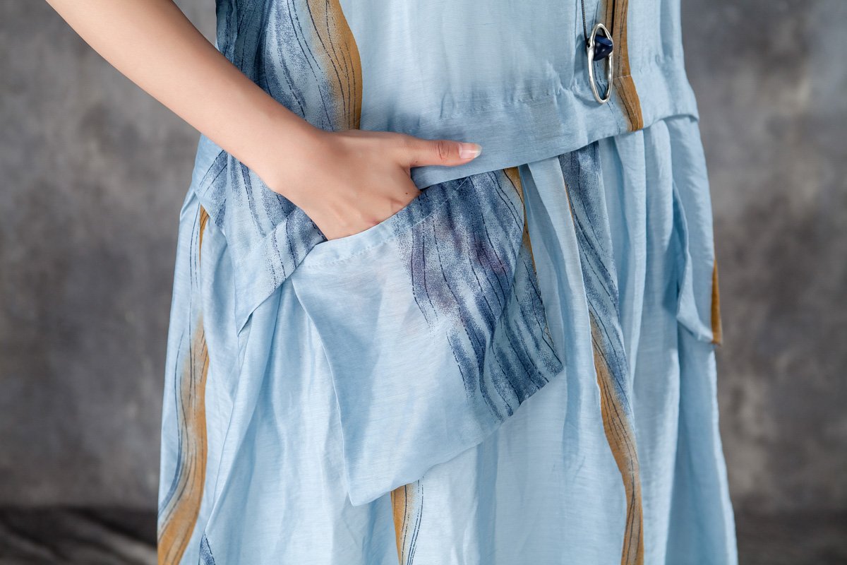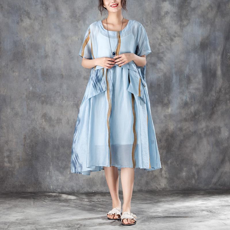 Summer Women Short Sleeve Pleated Blue Thin Dress