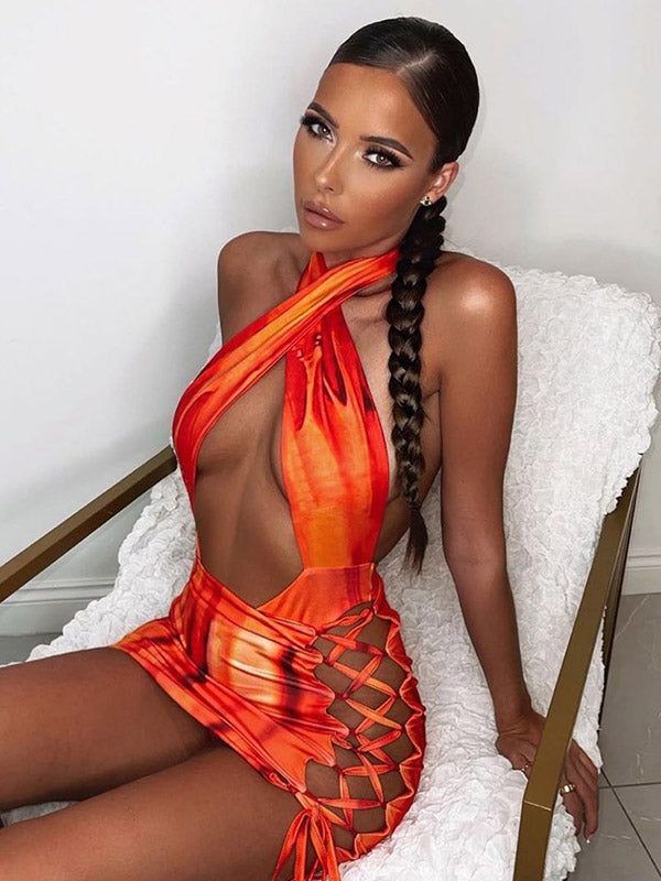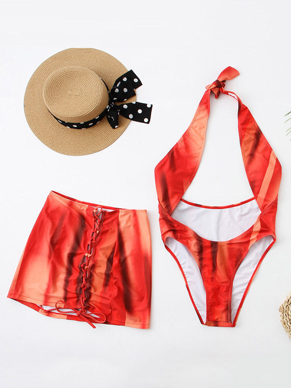 Tie-Dyed Hollow One-Piece Swimwear+Drawstring Cover-Ups Skirt Two-Pieces Set
