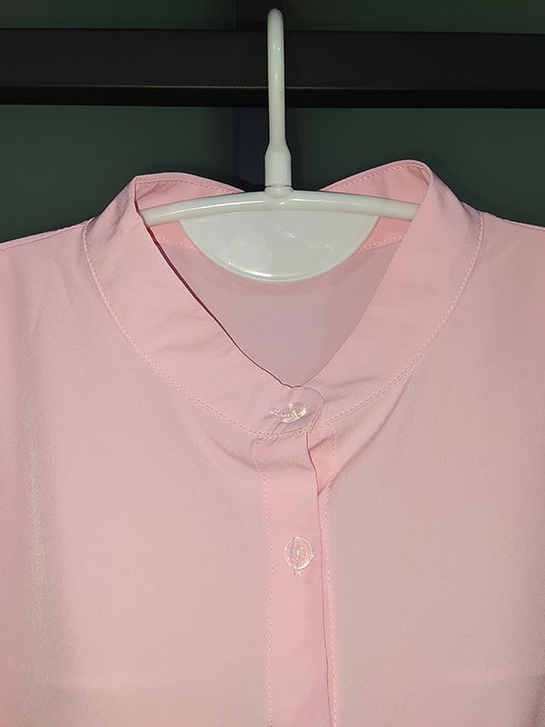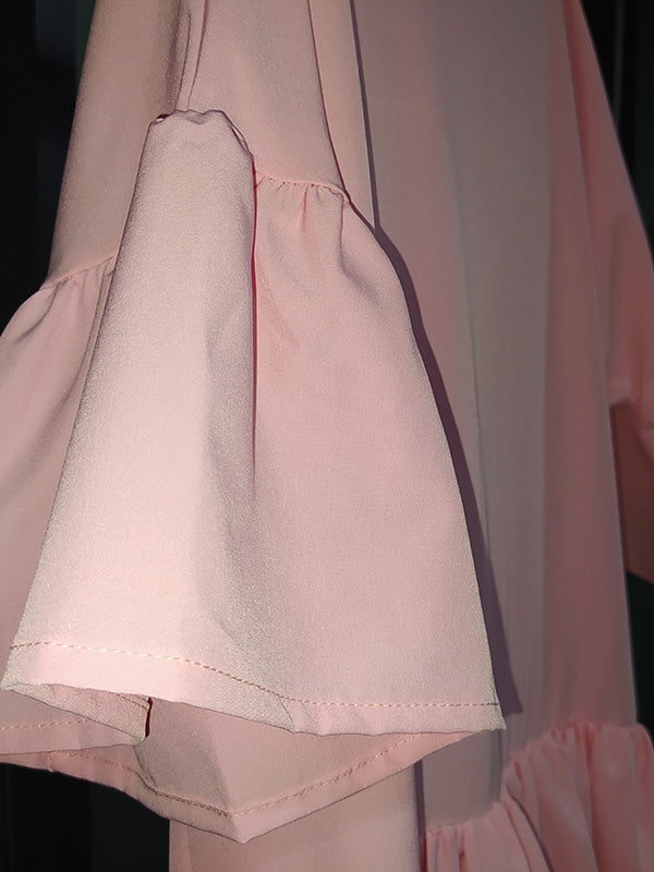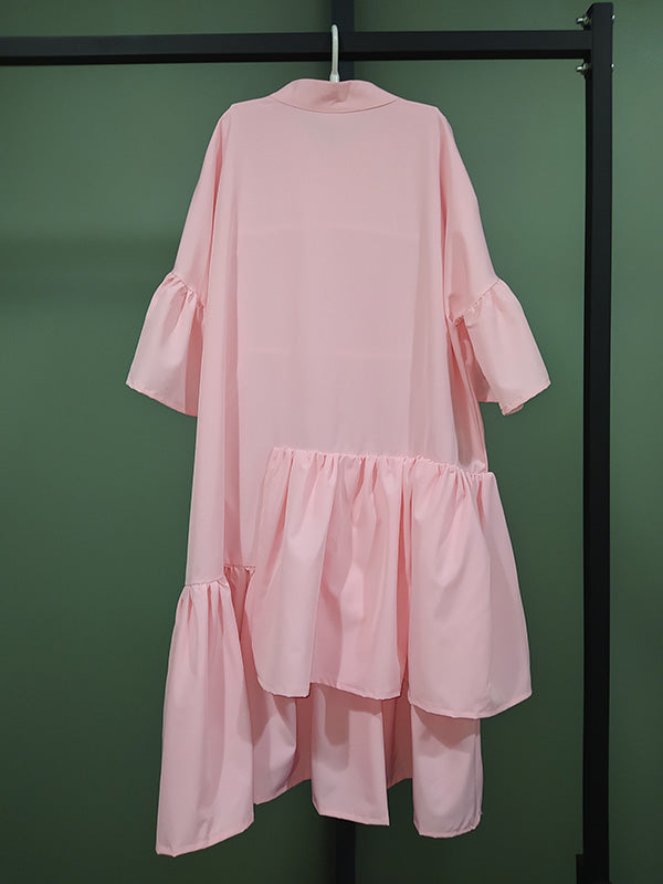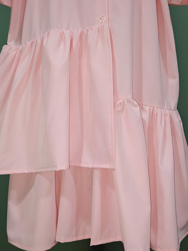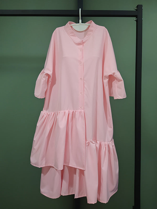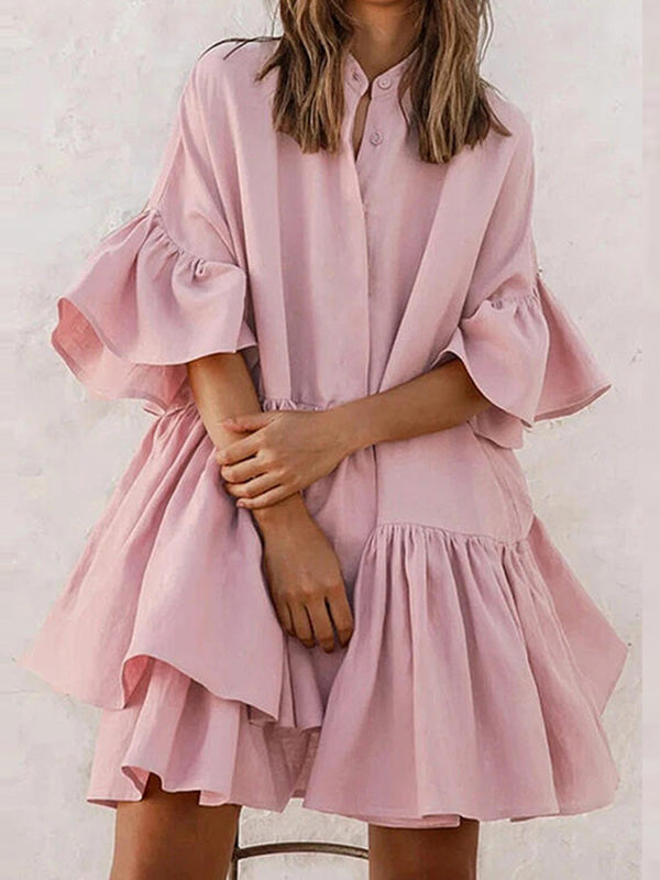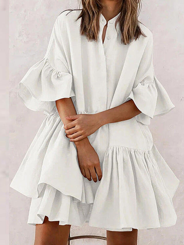 Urban Asymmetric Solid Color Ruffled Buttoned Stand Collar Flared Sleeve Mini Dress