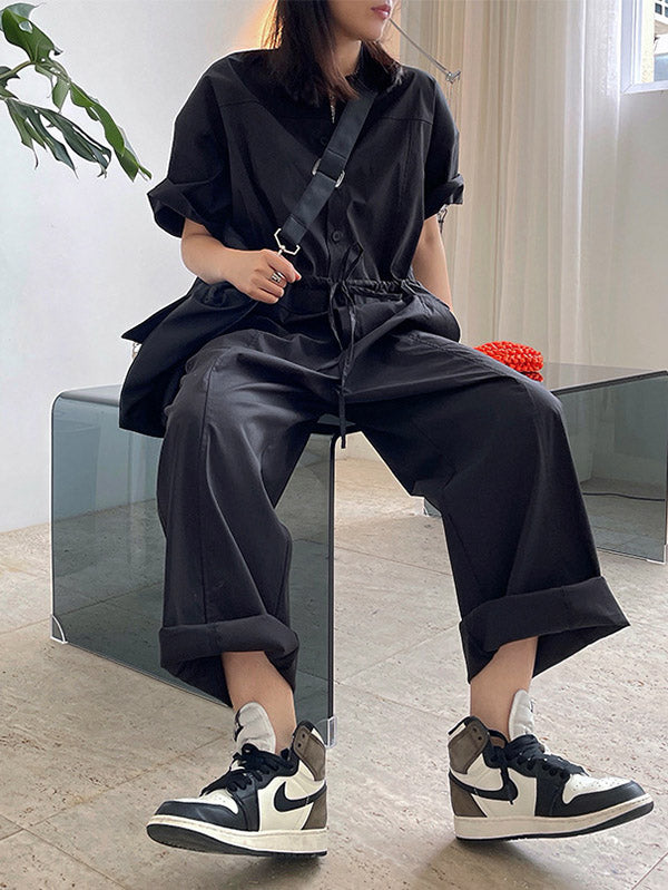 Urban Drawstring Elastic High Waisted Short Sleeves Wide Leg Jumpsuits