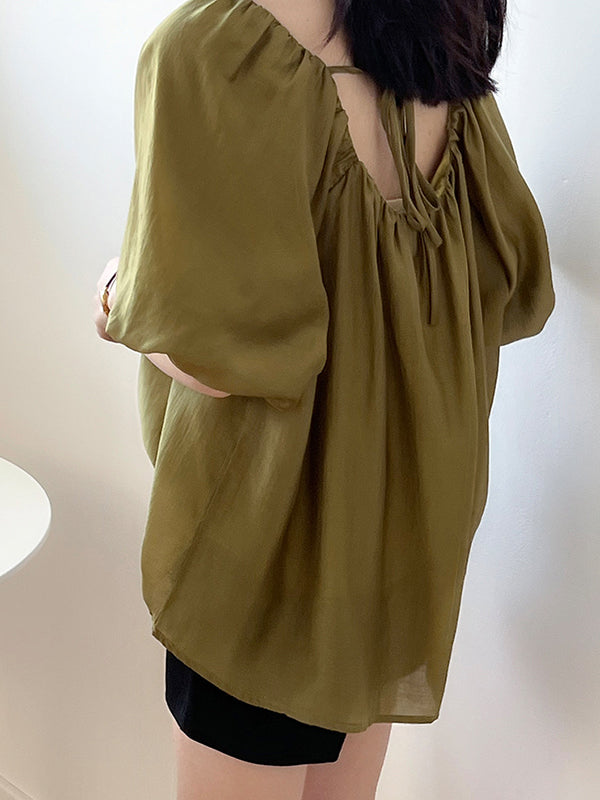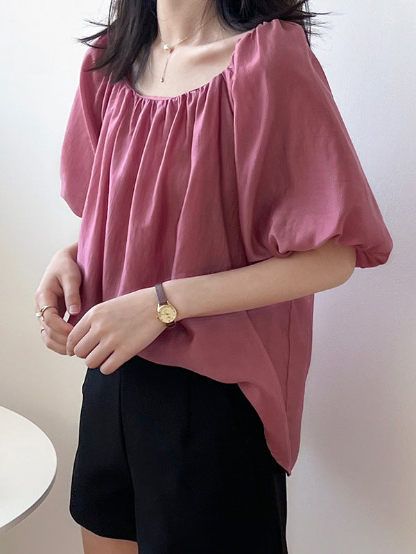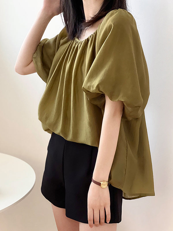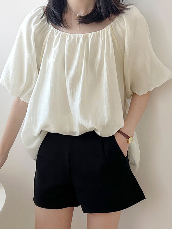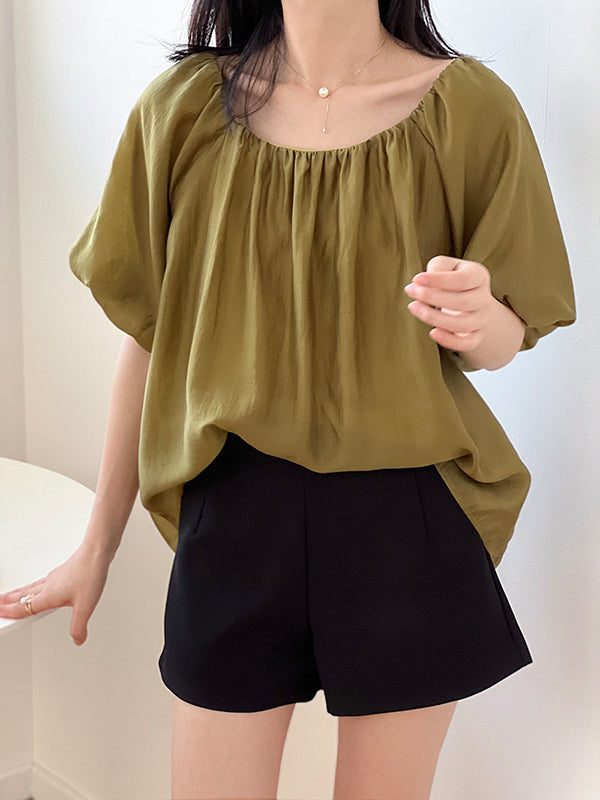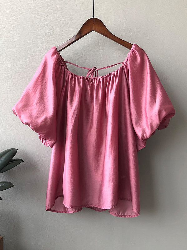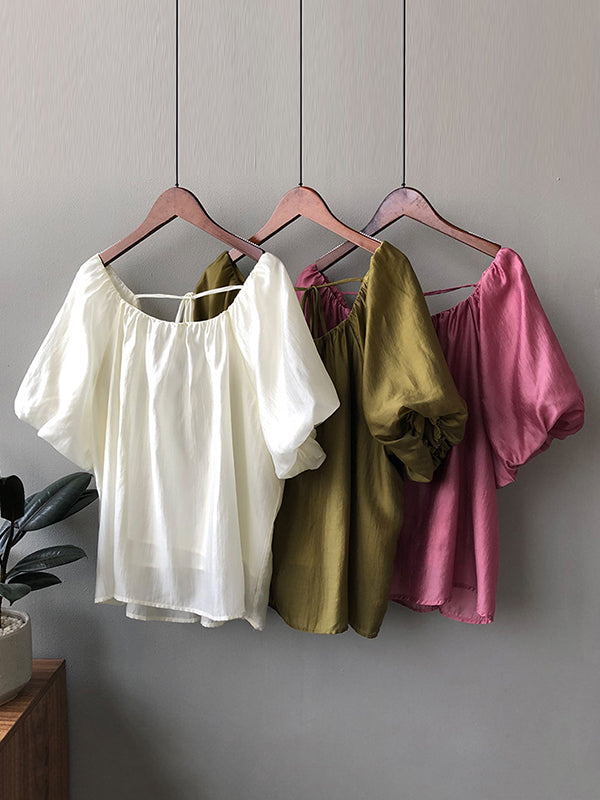 Urban Loose Solid Color Puff Sleeves Off-The-Shoulder T-Shirt