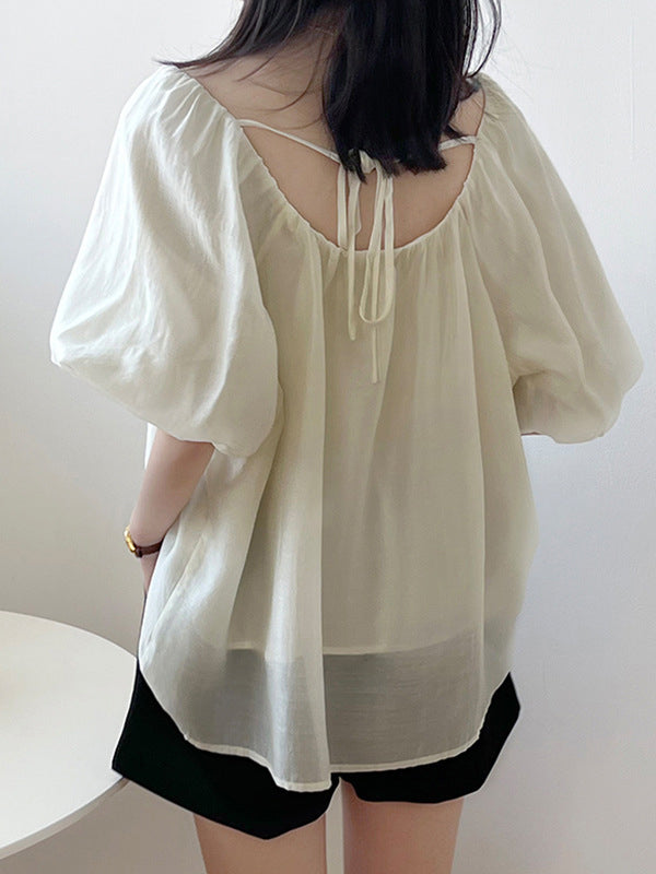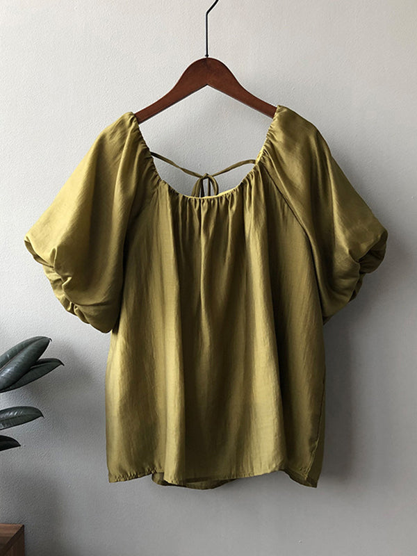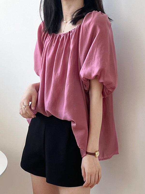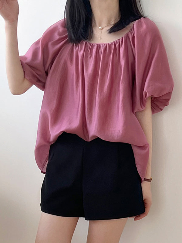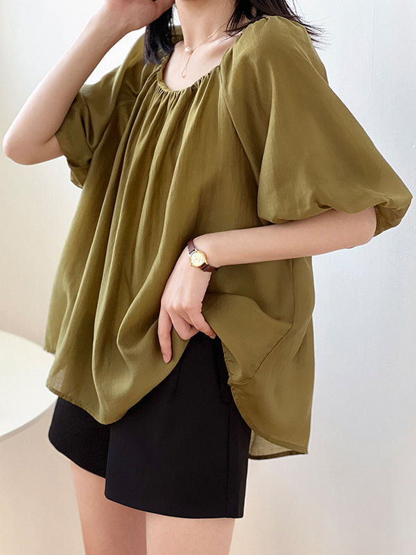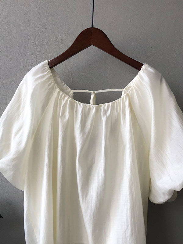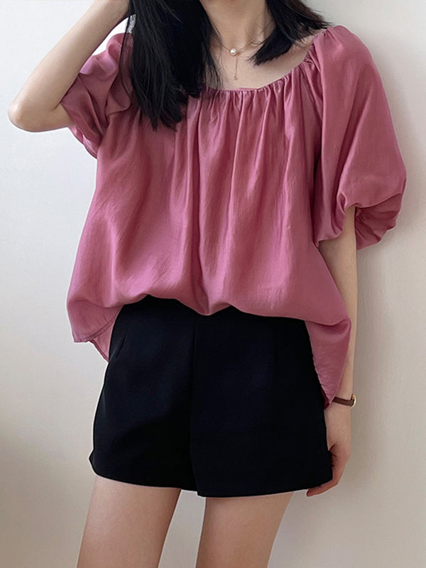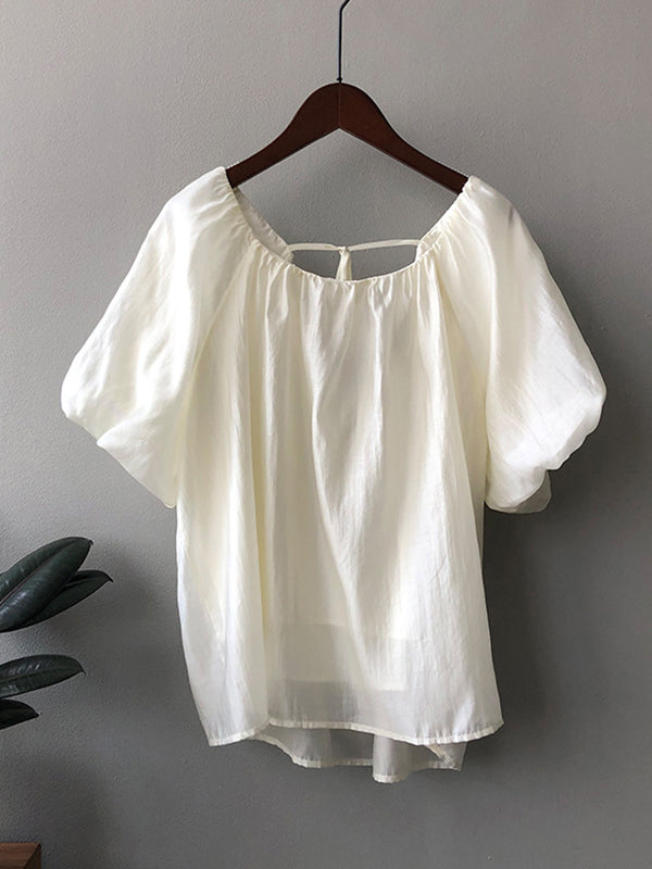 Urban Loose Solid Color Puff Sleeves Off-The-Shoulder T-Shirt