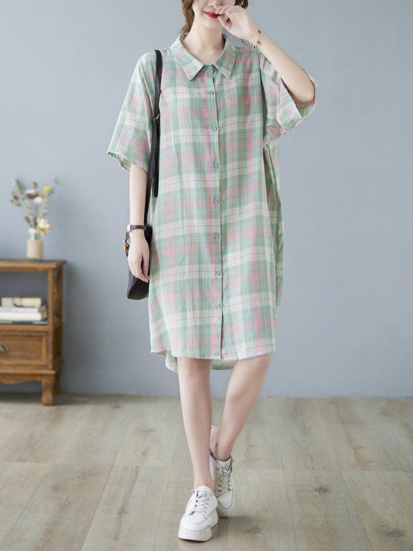 Urban Plaid Half Sleeve Lapel Shirt Dress