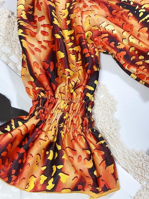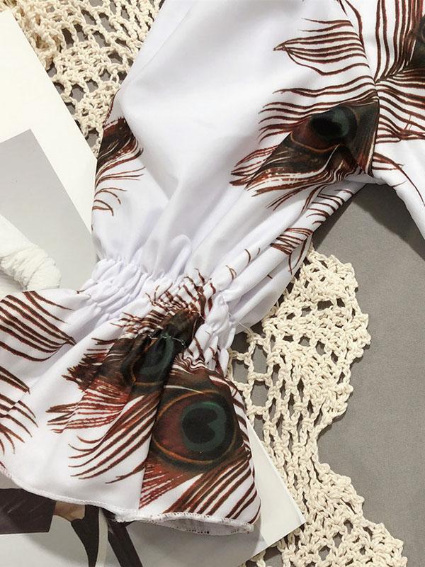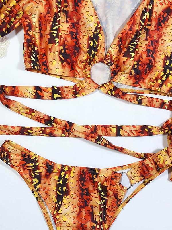 V-Neck Bandage Short Sleeves Printing Bikini Swimsuit