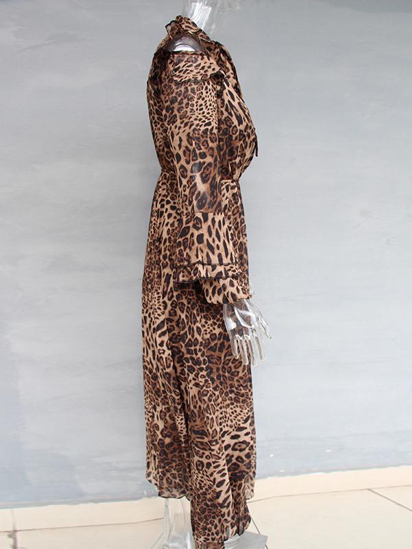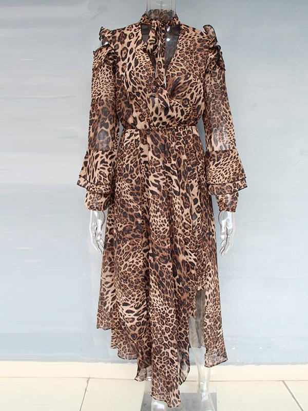 V-neck Chiffon Irregular Leopard Printed Maxi Dress