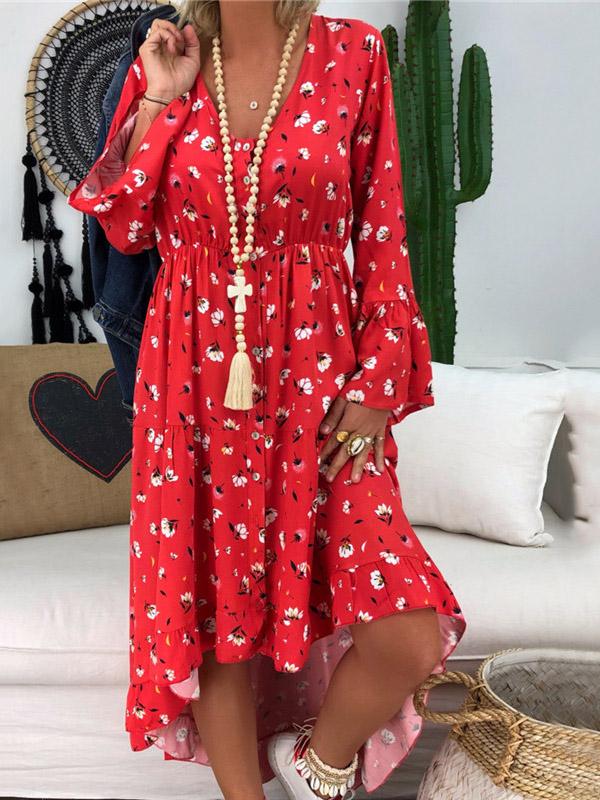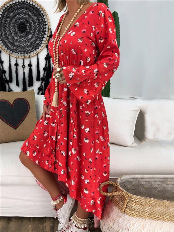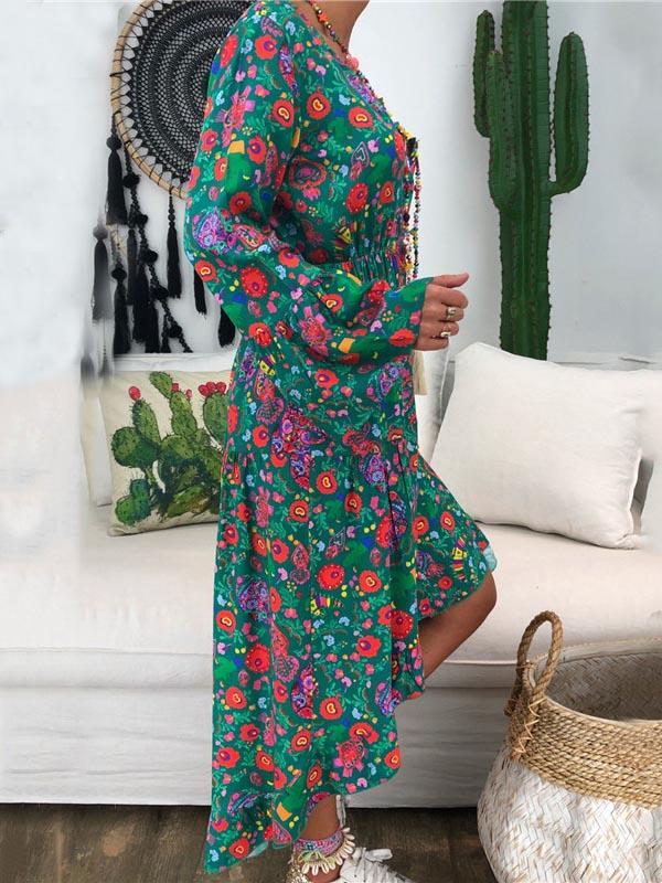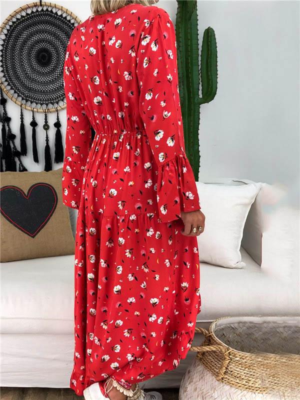 V-neck Floral Printed Long Sleeve Maxi Dress