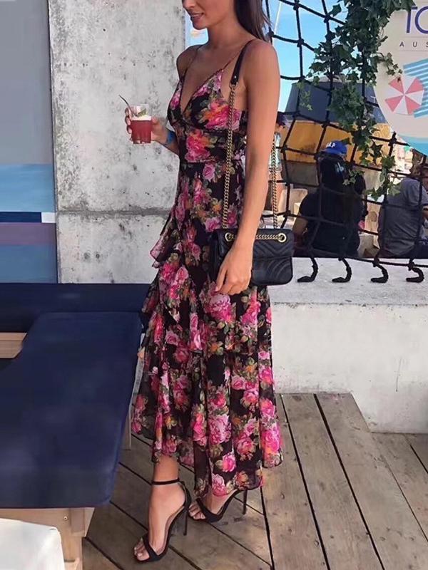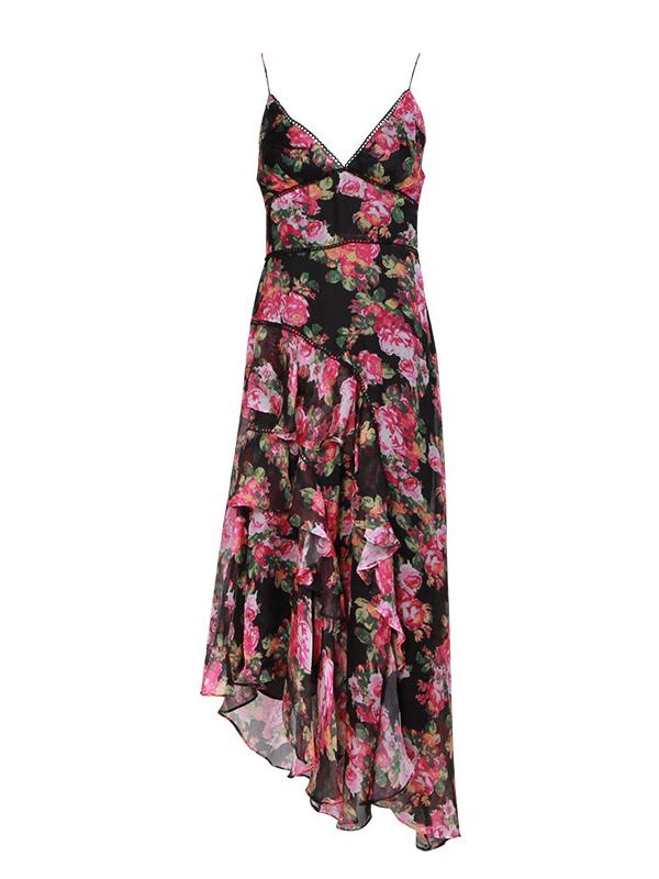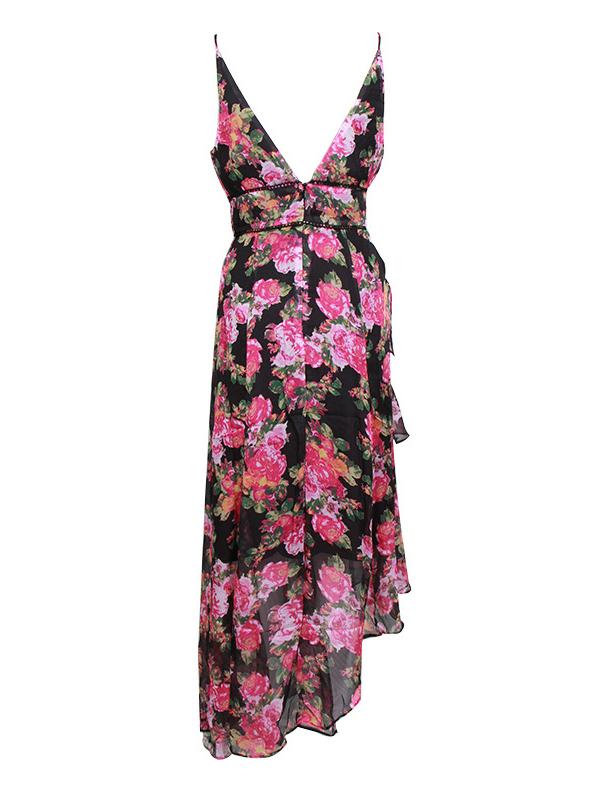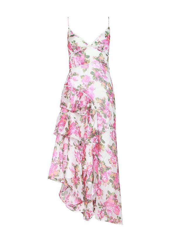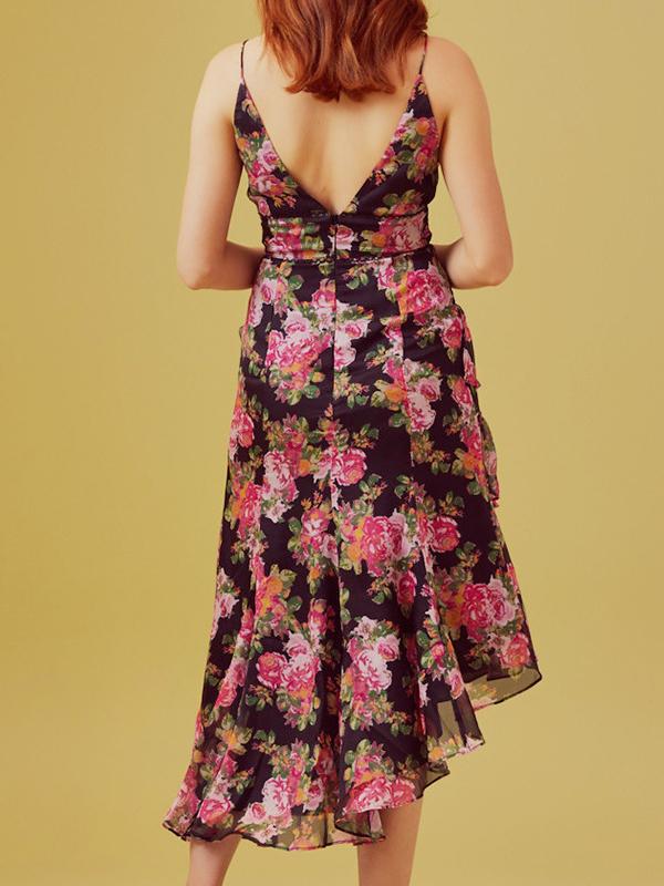 V-neck Irregular Bottom Floral Printed Midi Dress