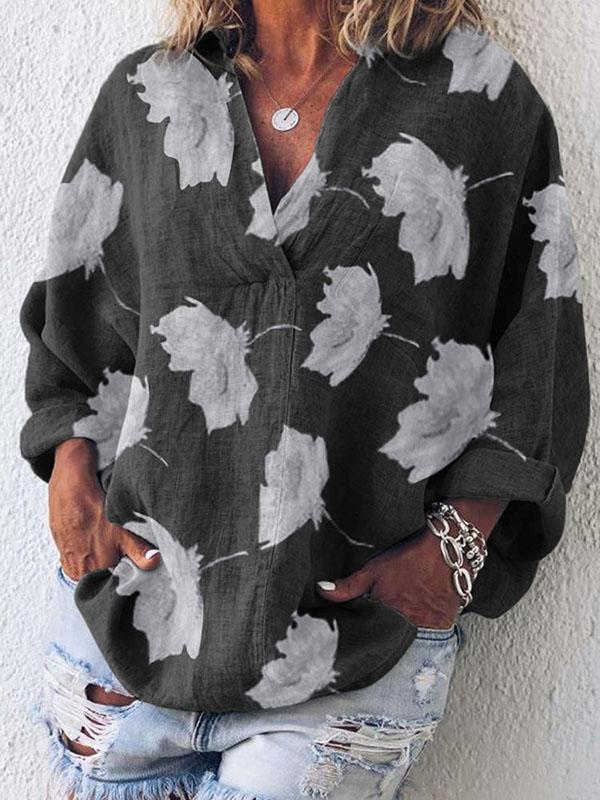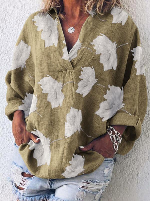 V-neck Printed Long Sleeve Blouses&ShirtsTops