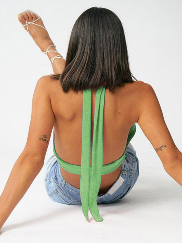 V-Neck Solid Color Halter-Neck Vest