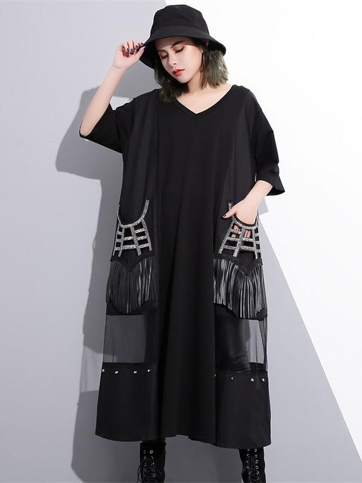 V-neck Split-joint Tasseled Shirt Midi Dresses
