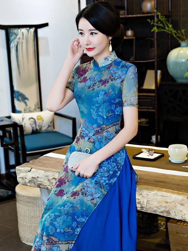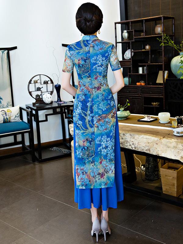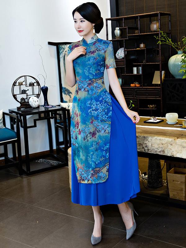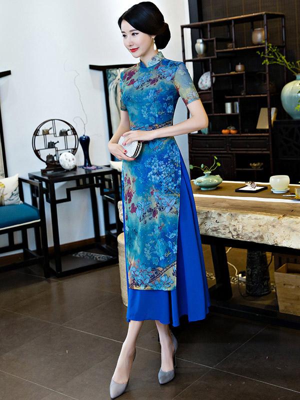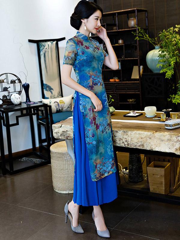 Vintage Blue Floral Stand-collar Ao Dai Long Cheongsam