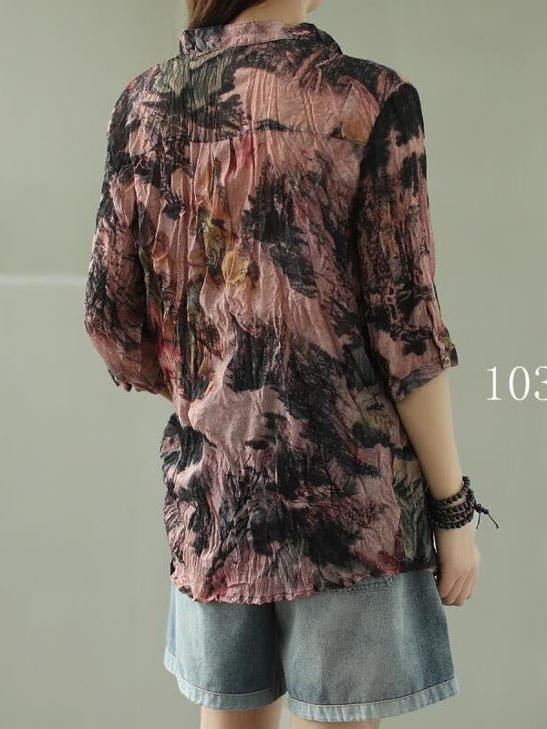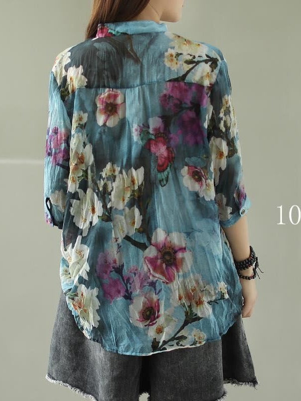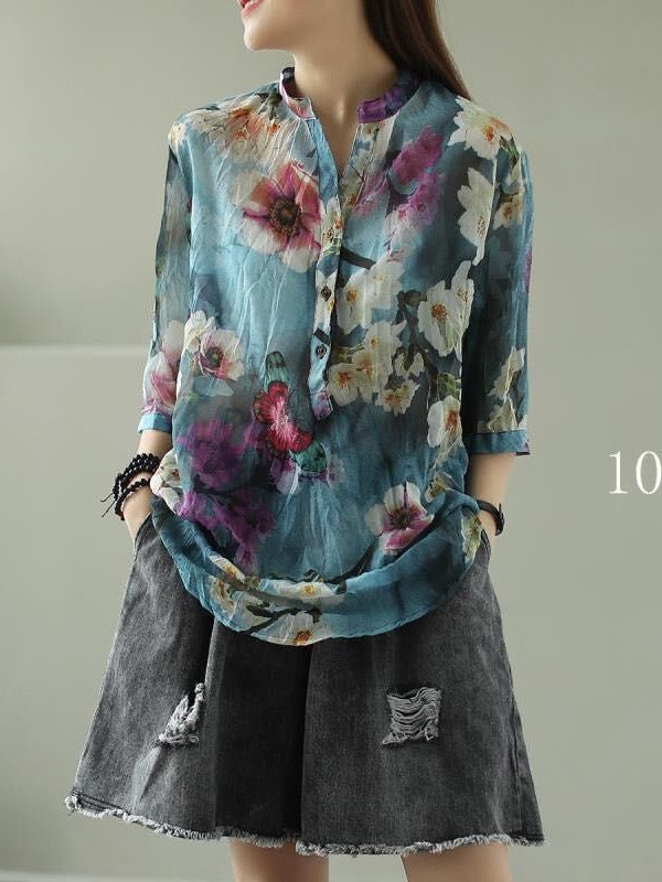 VINTAGE FLORAL THREE-QUARTER SLEEVE STAND COLLAR SHIRT