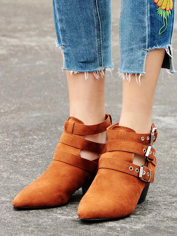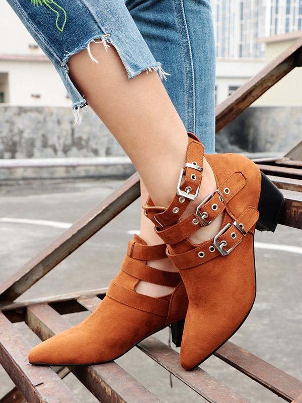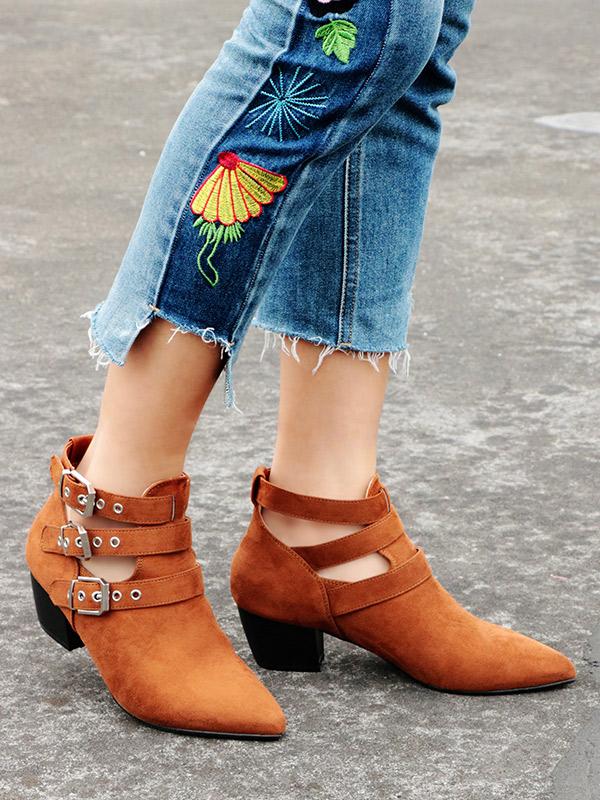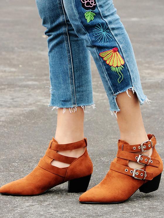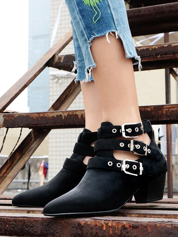 Vintage Hollow Buckle Pointed Booties