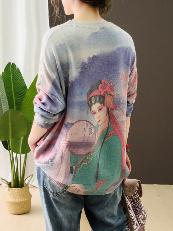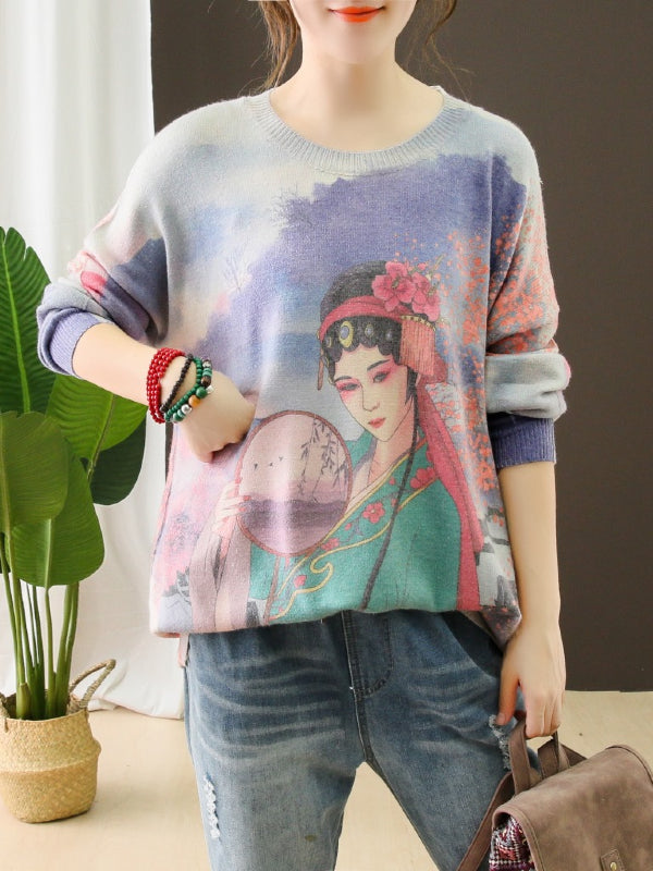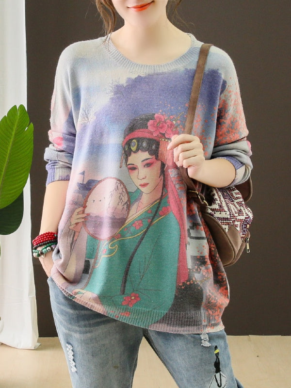 VINTAGE OPERA FIGURE PRINTED ROUND-NECK SWEATER
