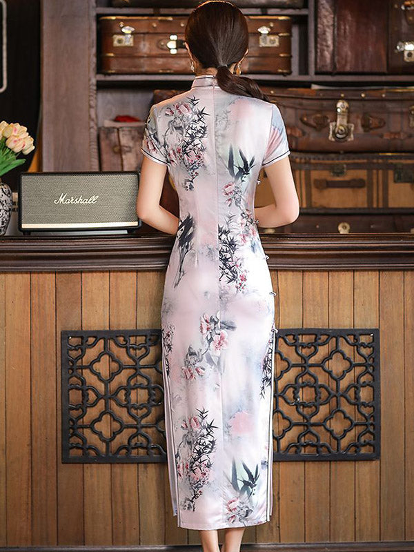 Vintage Printed Split-Side Short Sleeves Silk Long Cheongsams