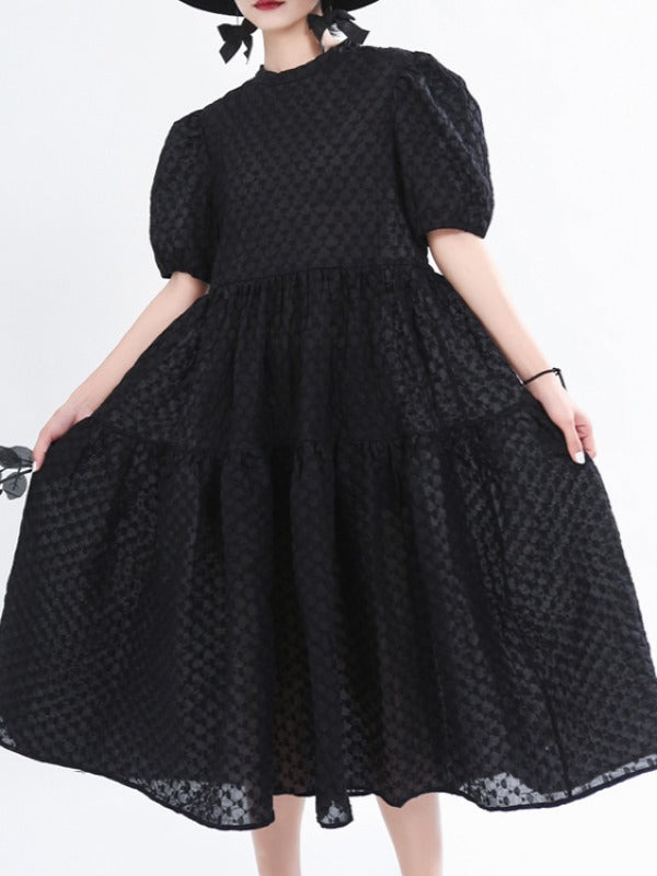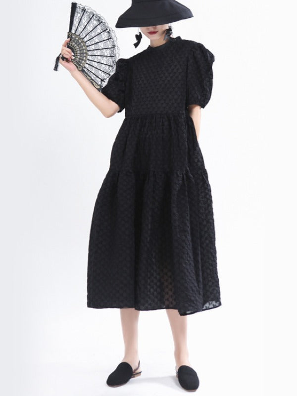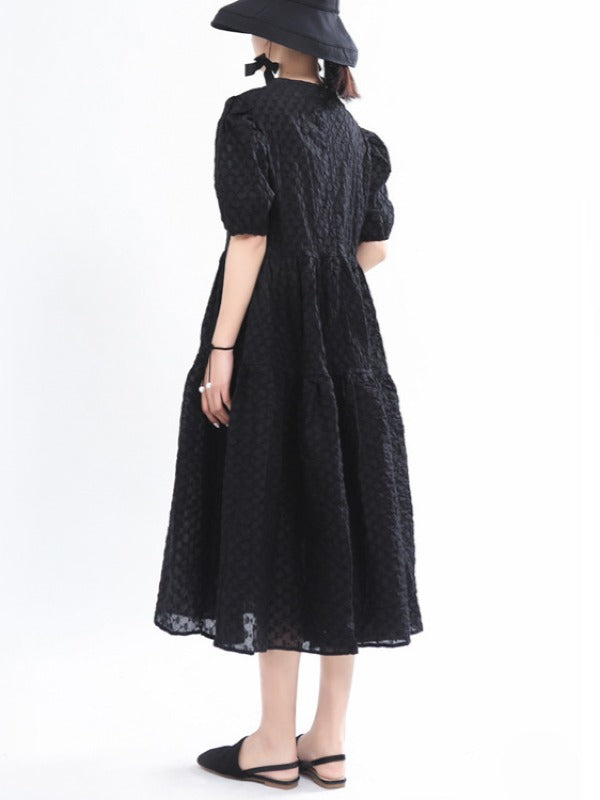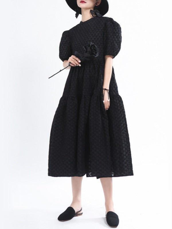 VINTAGE PUFF SLEEVE TEXTURED SOLID MIDI DRESS