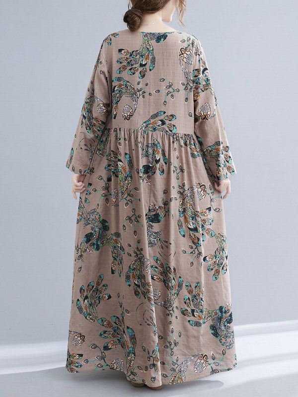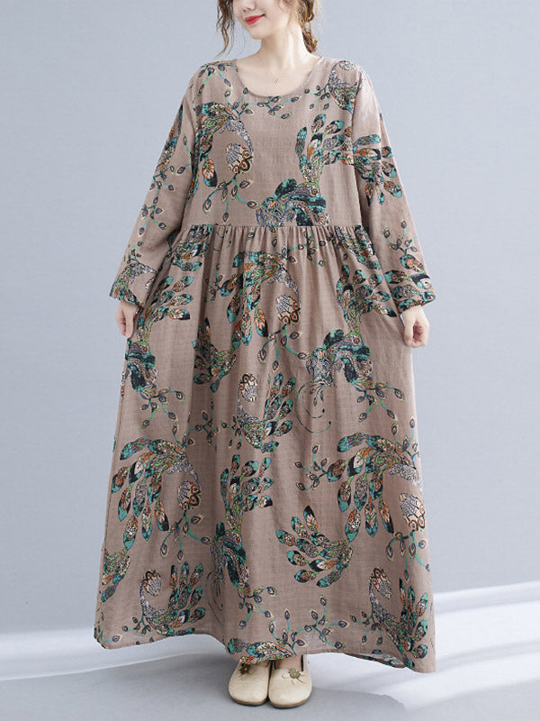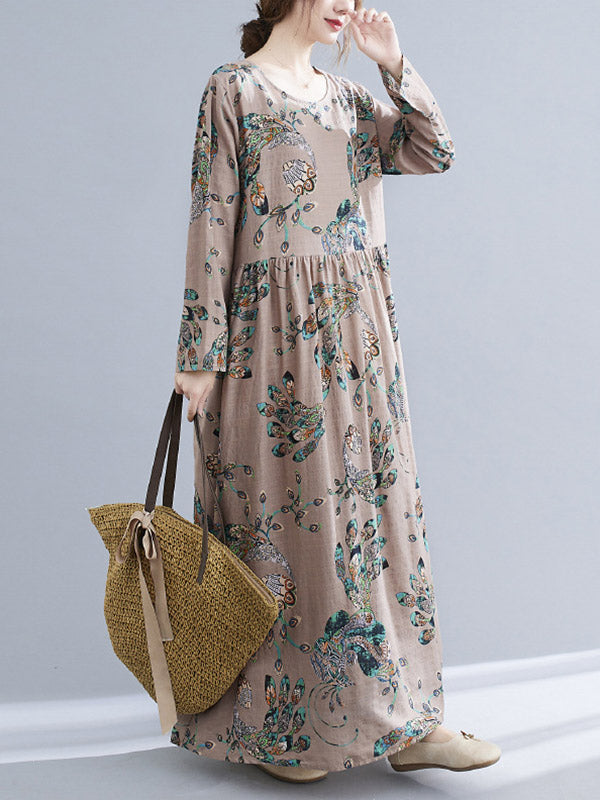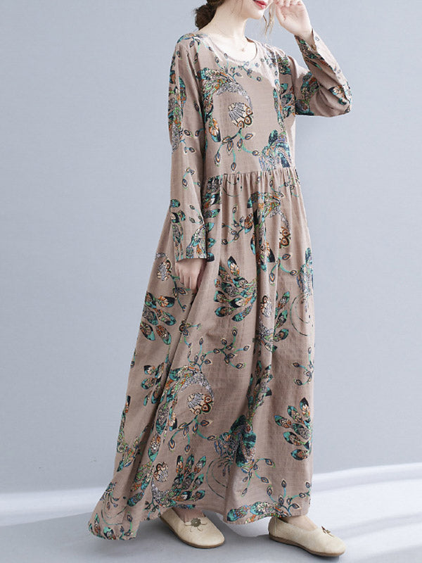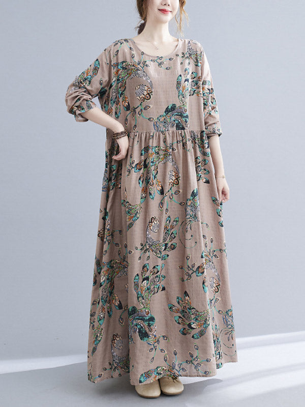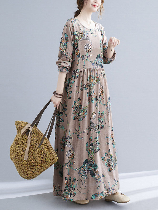 Vintage Ramie Cotton Floral Printed Round-Neck Long Sleeves Loose Maxi Dress