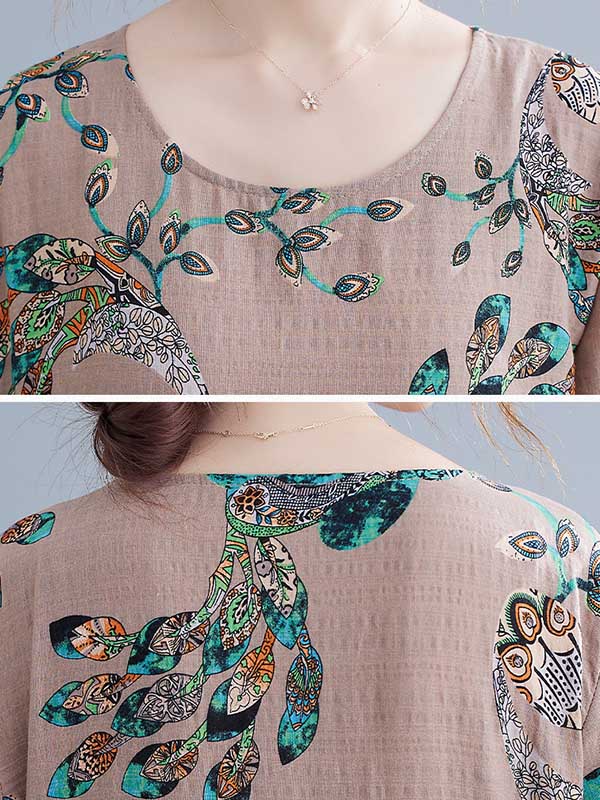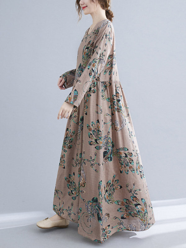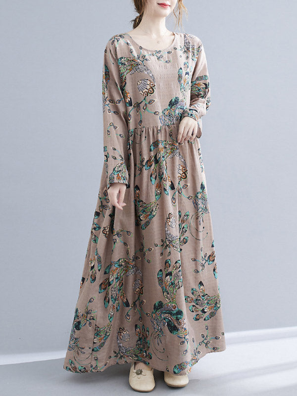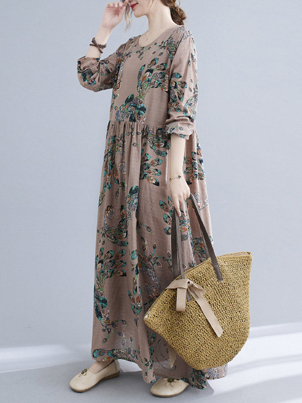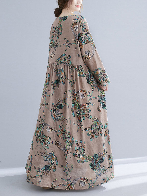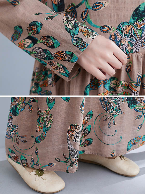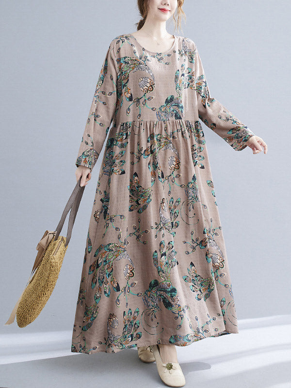 Vintage Ramie Cotton Floral Printed Round-Neck Long Sleeves Loose Maxi Dress