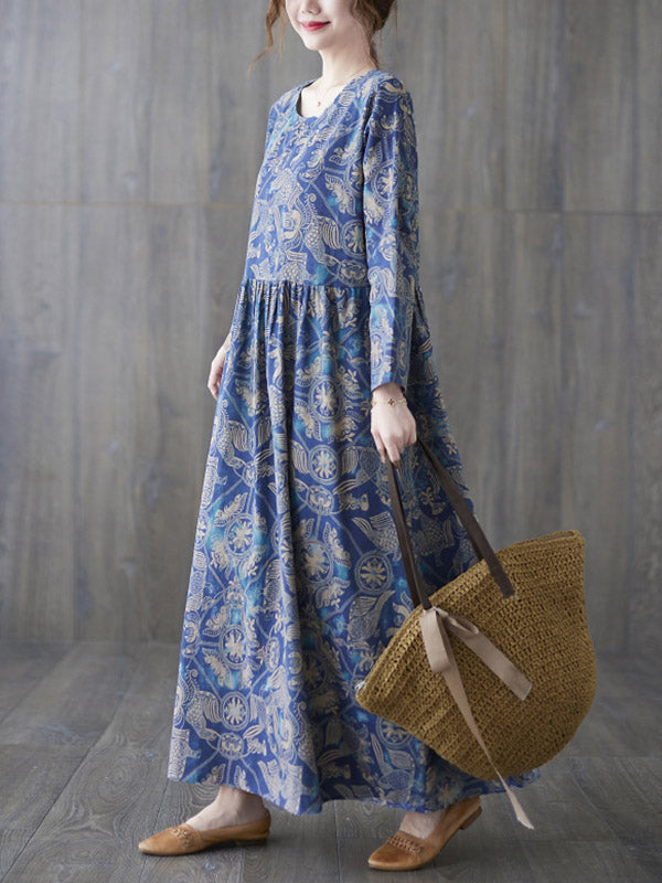 Vintage Ramie Cotton Floral Printed Round-Neck Long Sleeves Maxi Dress