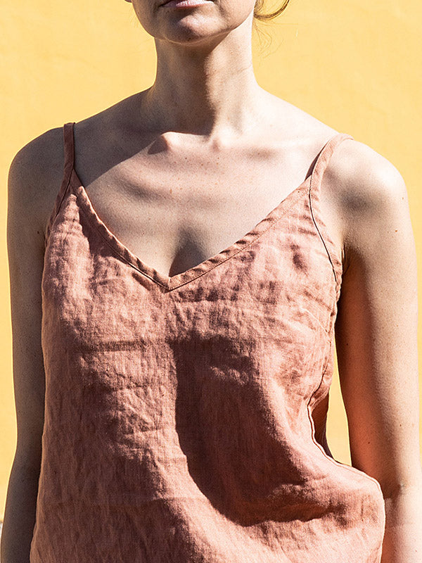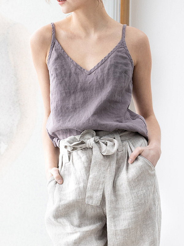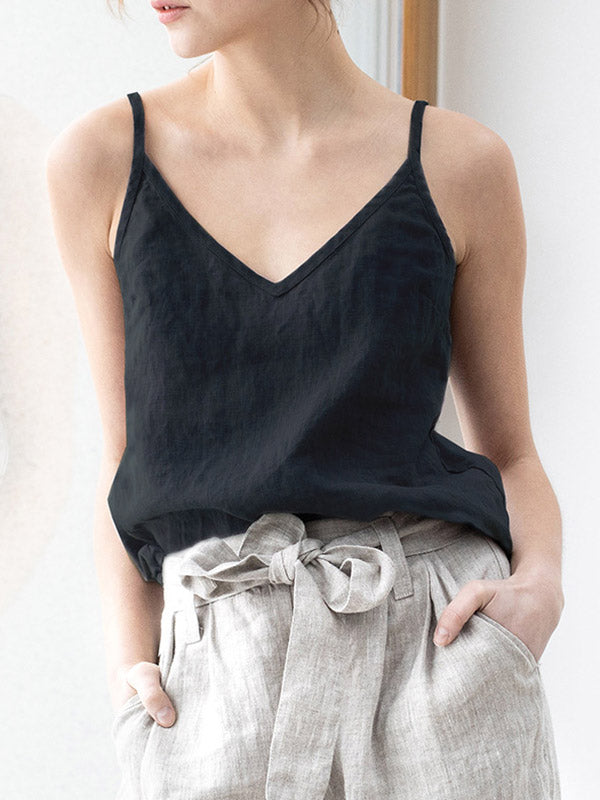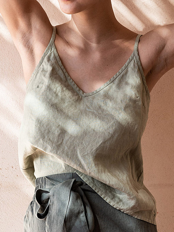 Vintage Ramie Cotton Spaghetti-Neck V-Neck Mini Dress