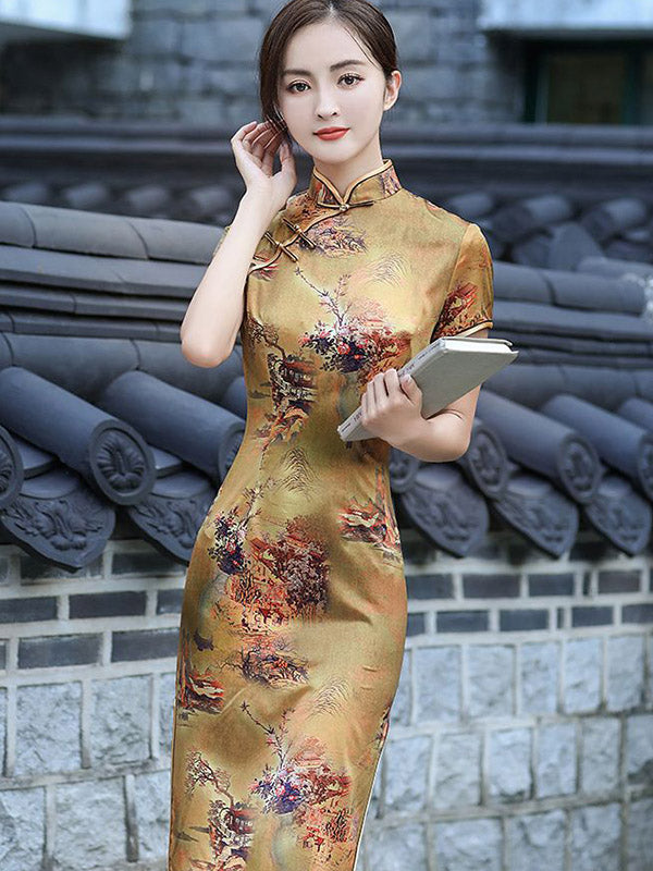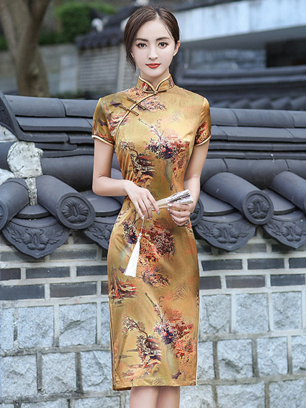 Vintage Satin Split-Side Printed Short Sleeves Stand Collar Short Cheongsams