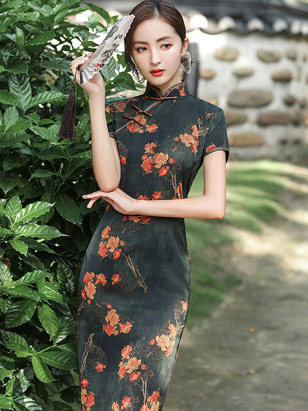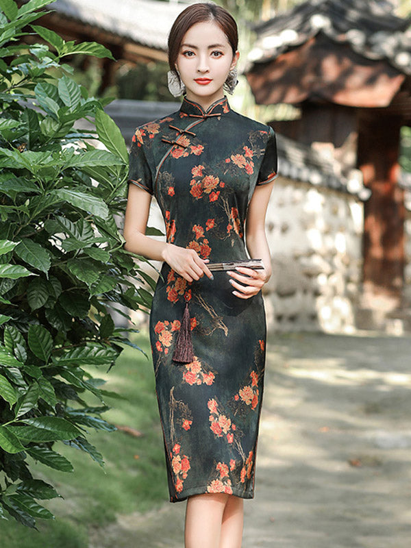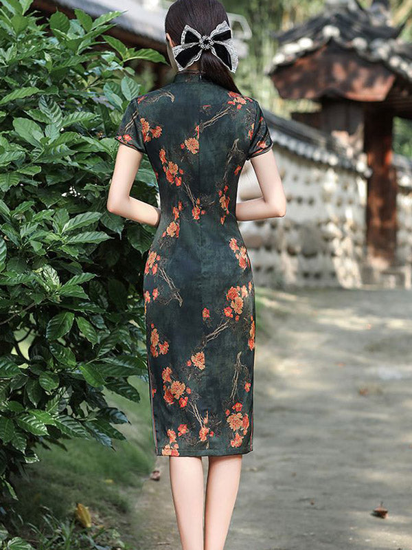 Vintage Silk Split-Side Floral Printed Stand Collar Short Sleeves Cheongsams