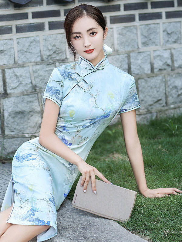 Vintage Split-Side Stand Collar Printed Short Sleeves Cheongsams