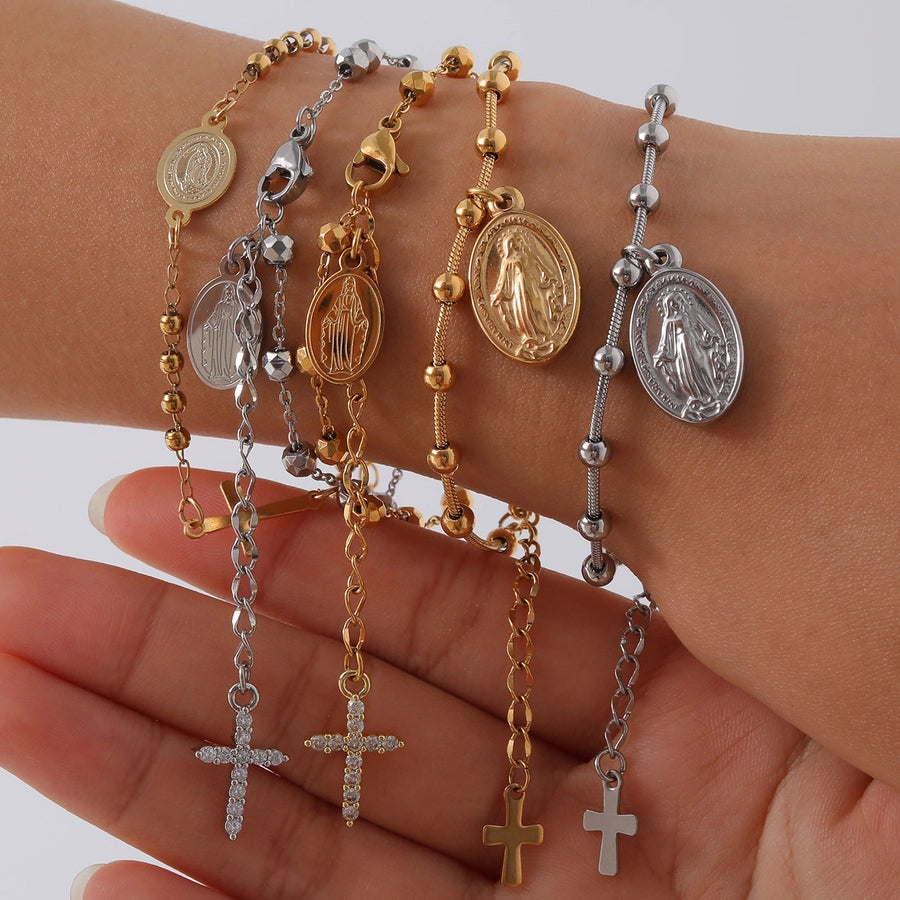 Vintage Style Classic Style Cross Virgin Mary 304 Stainless Steel 18K Gold Plated cable chain Bracelets In Bulk Stainless Steel Bracelets