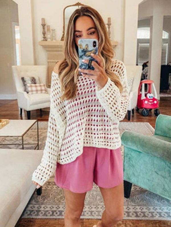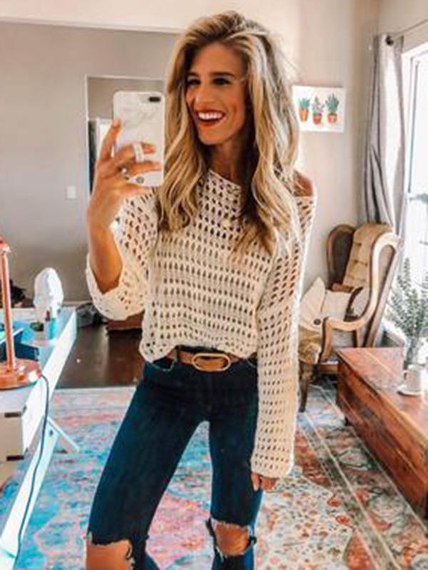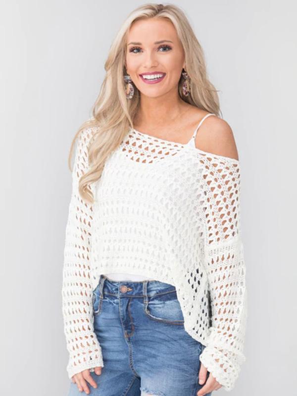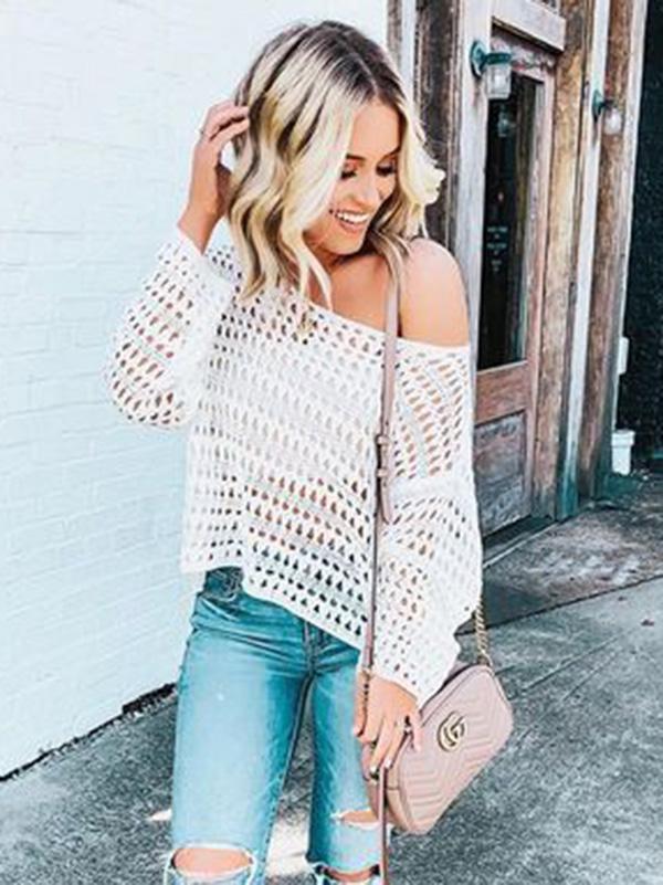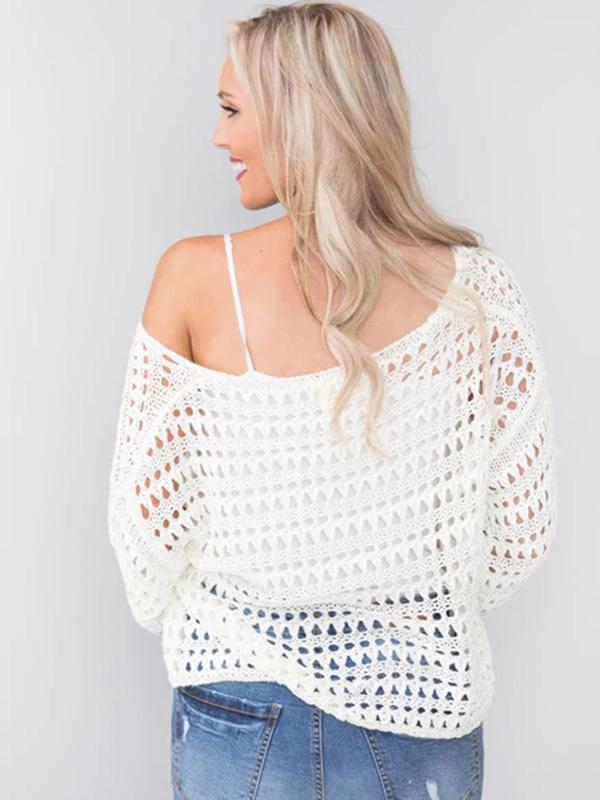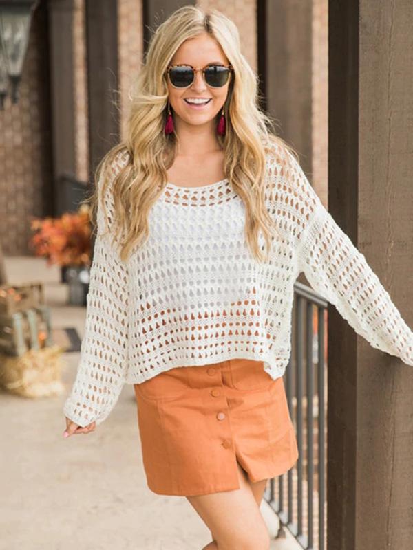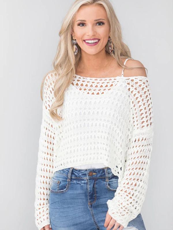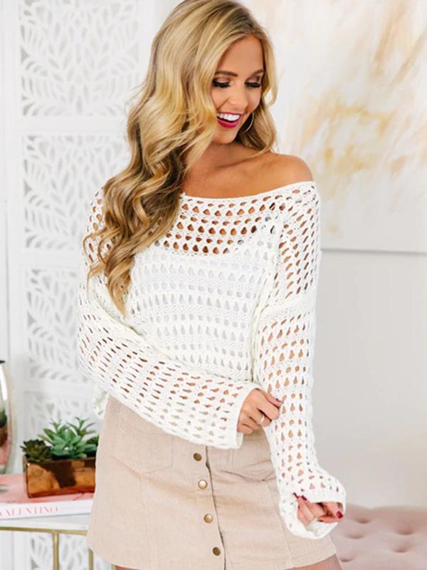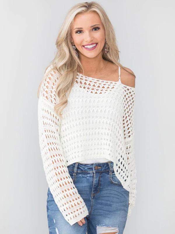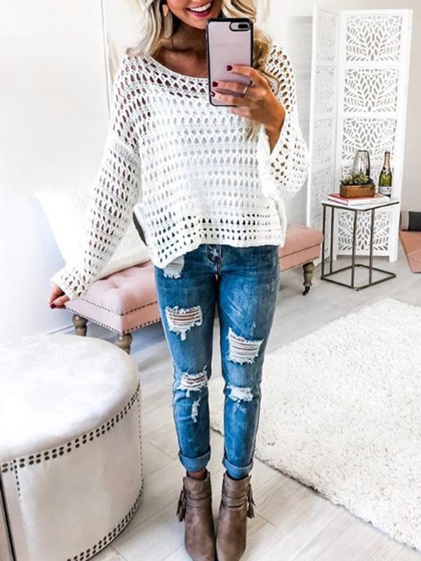 White Long Sleeve Hollow Blouses&Shirts Tops