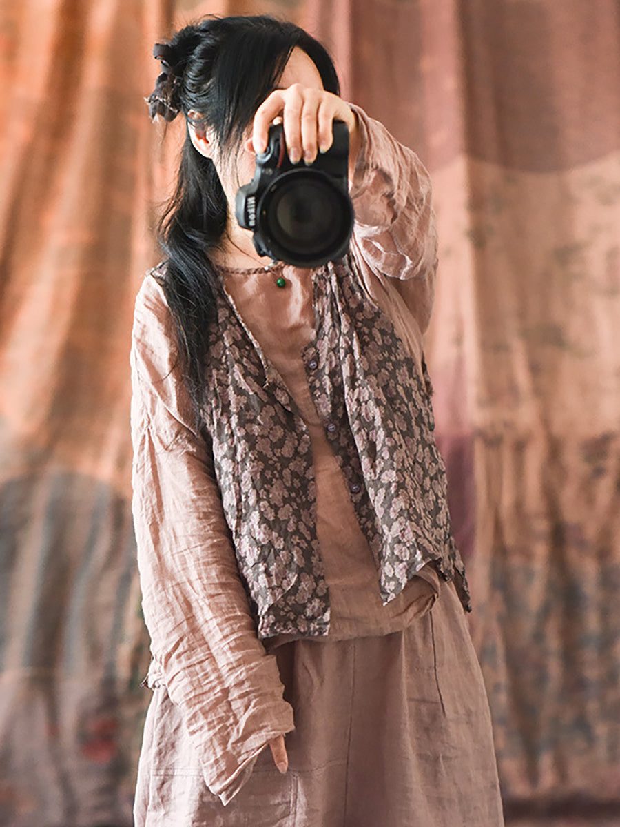 Women Artsy Floral Summer Ramie V-Neck Vest