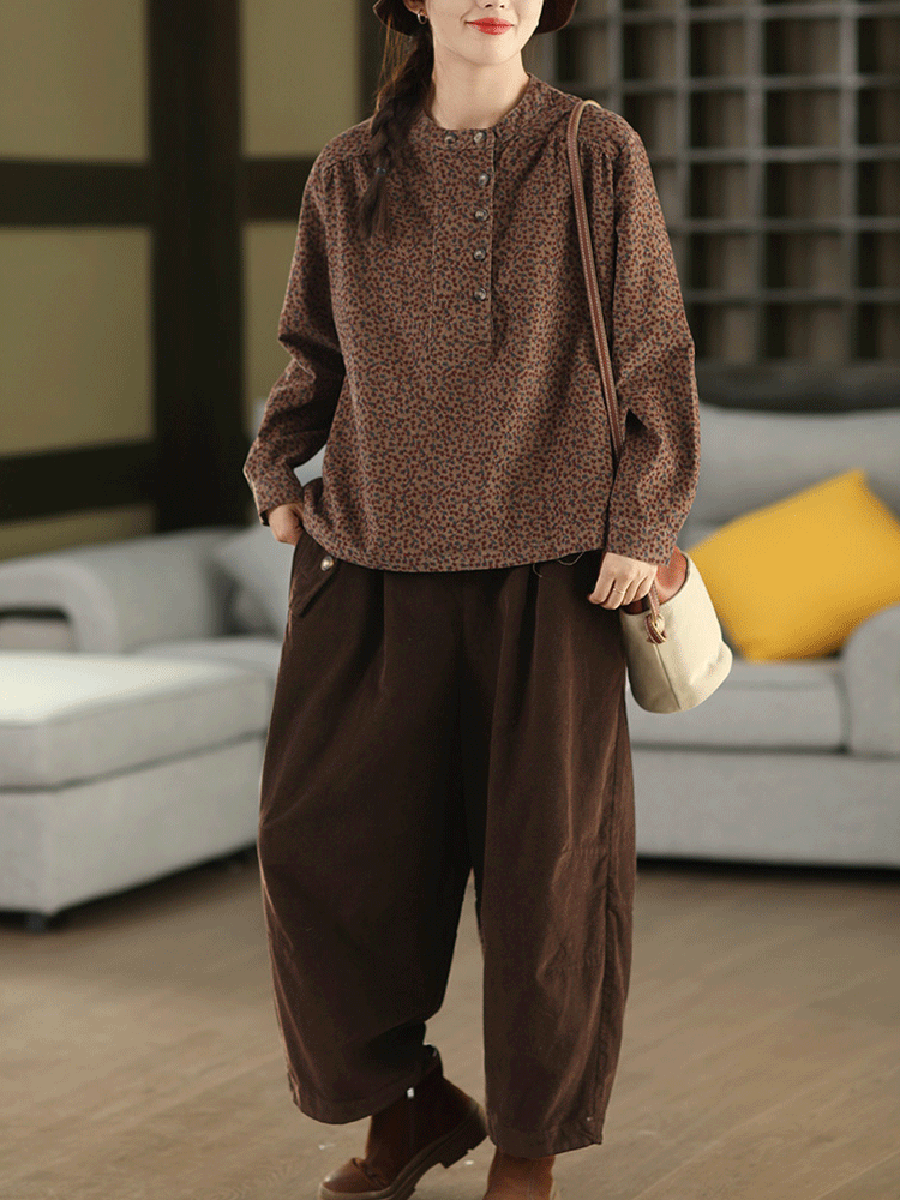 Women Autumn 100%Cotton Floral Stand Collar Shirt