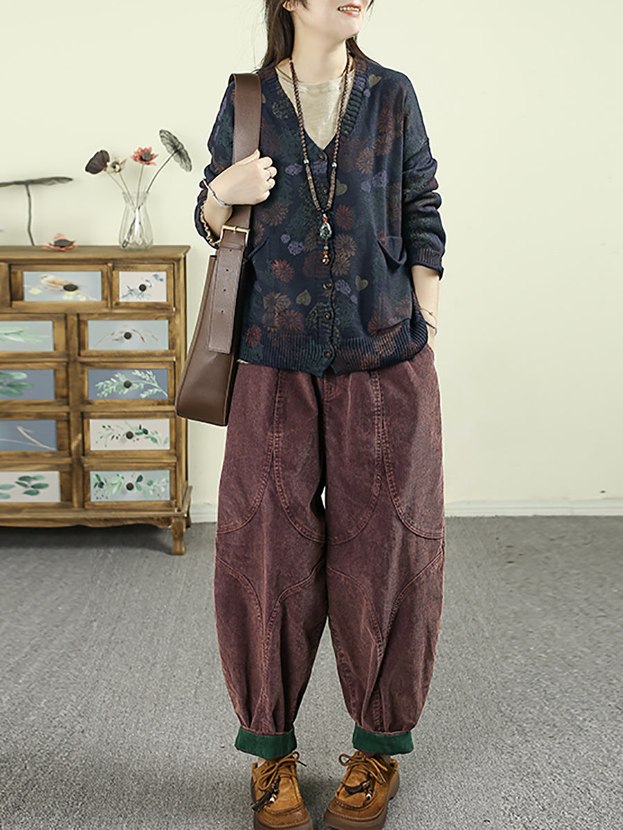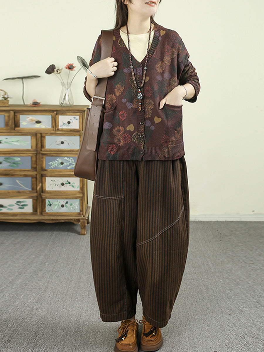 Women Autumn Artsy Flower Knitted V-Neck Sweater