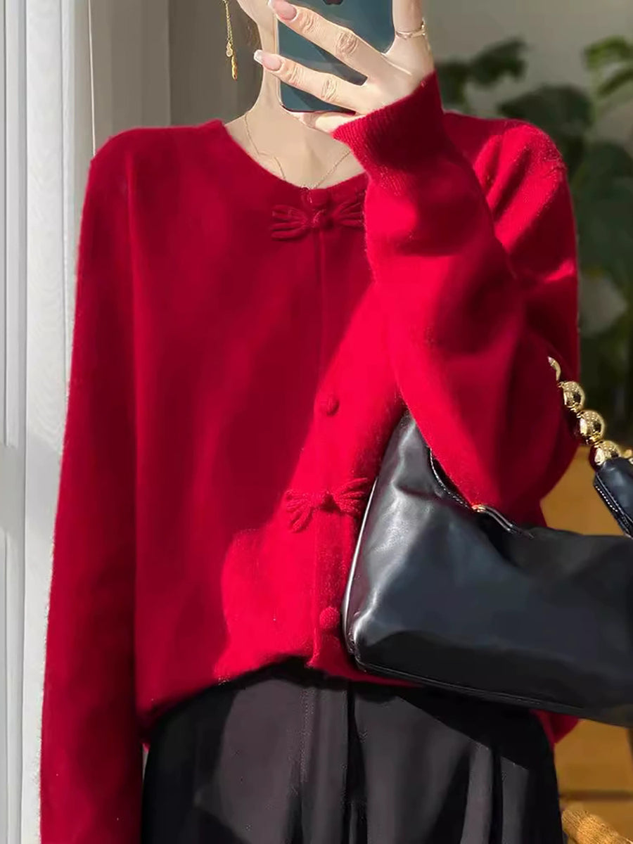 Women Autumn Artsy Knitted Wool O-Neck Cardigan Sweater