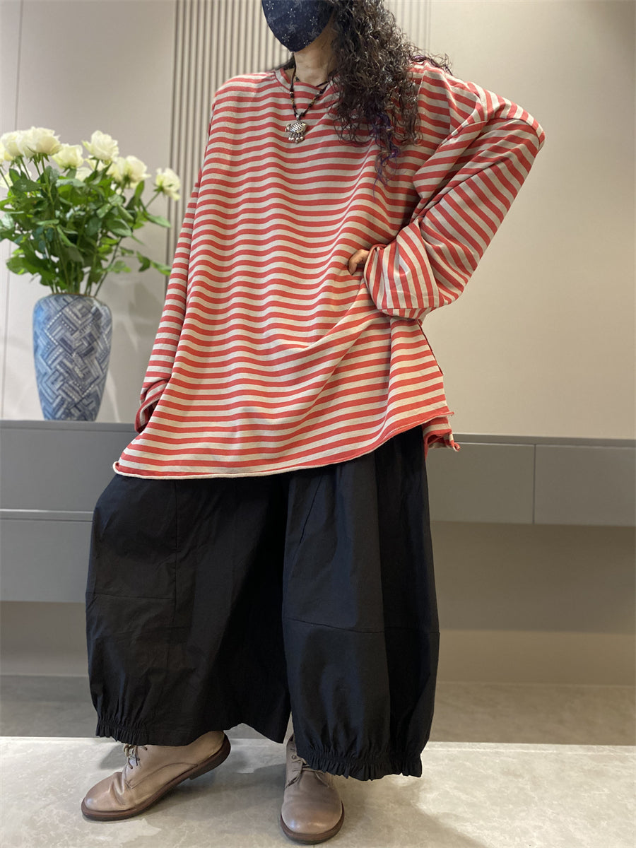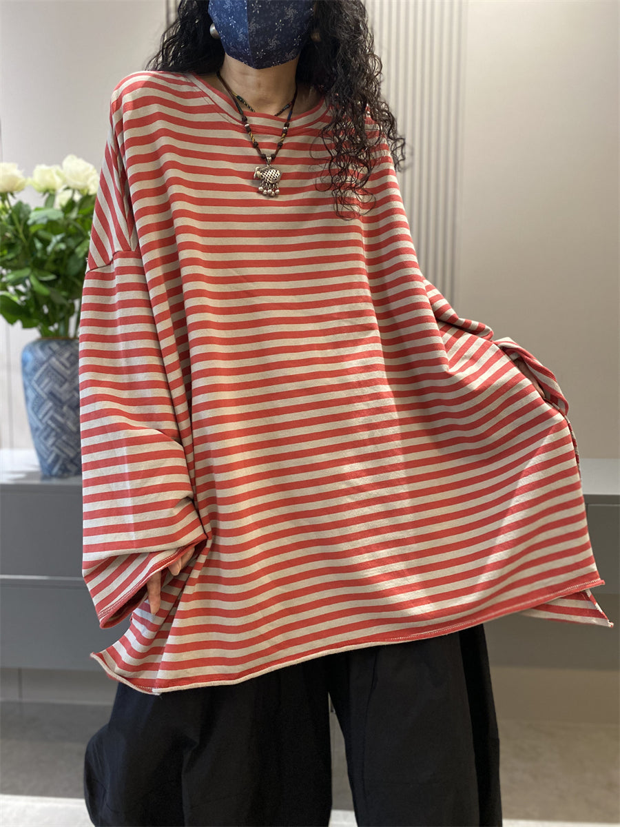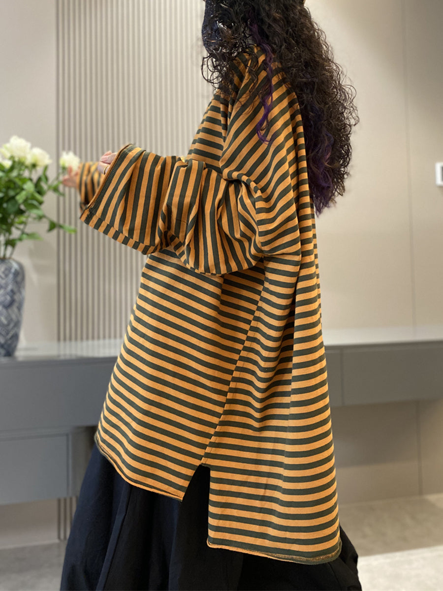 Women Autumn Casual Stripe Cotton O-Neck Shirt