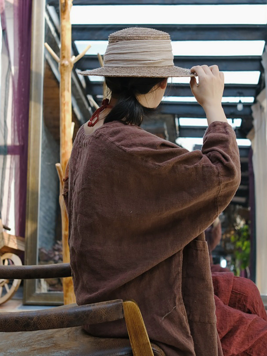Made of 100% Linen. this coat features a unique pattern of flowers and a V-neck collar. The full raglan sleeves and retro style make it perfect for the winter and autumn seasons.