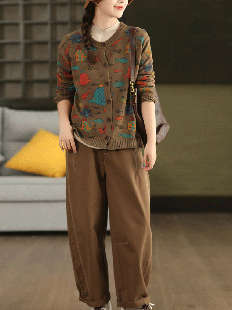 Women Autumn Artsy Cartoon Fish O-Neck Sweater