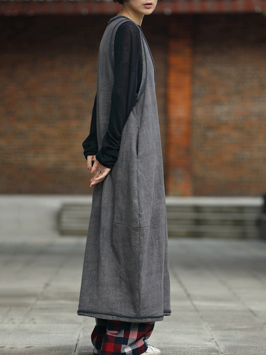 Women Autumn Retro Pure Color 100%Cotton V-Neck Vest Dress