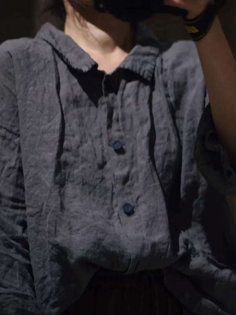 Women Autumn Retro Pure Color Linen Turn-down Collar Shirt