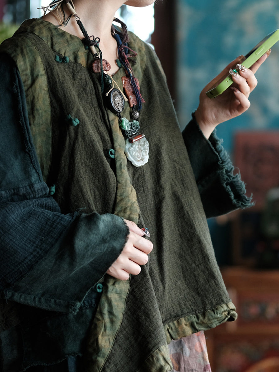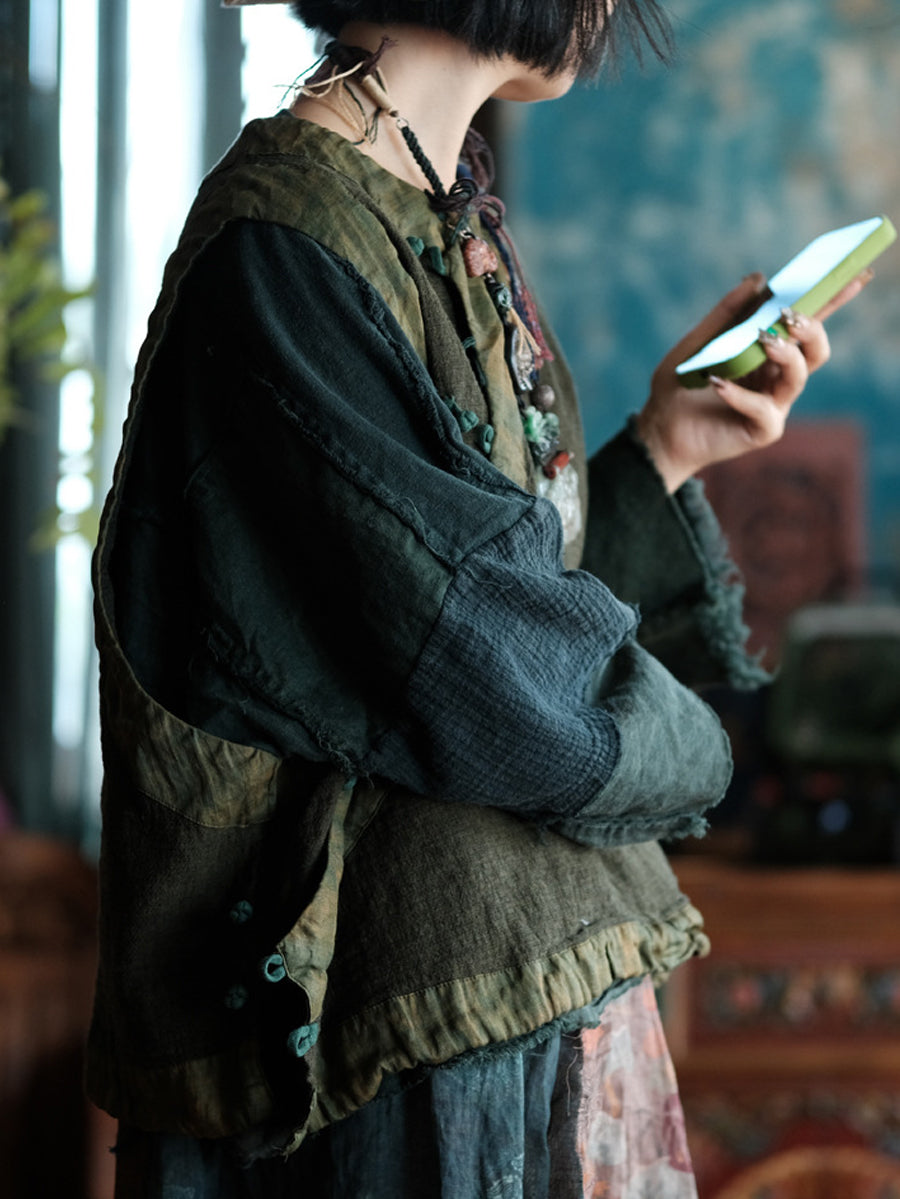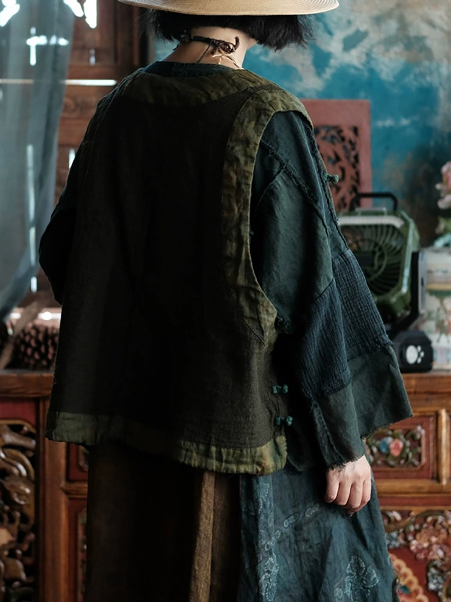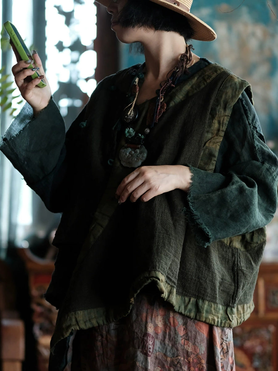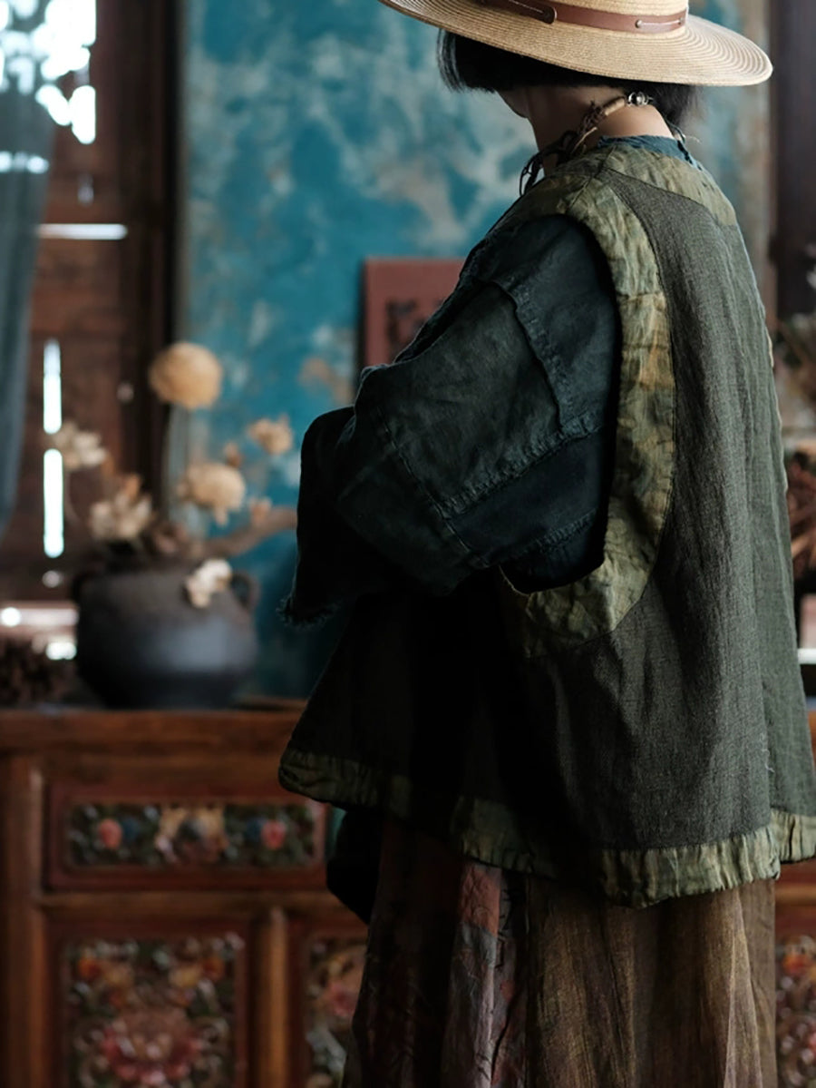 Women Autumn Retro Tie-dye Spliced V-Neck Cotton Vest