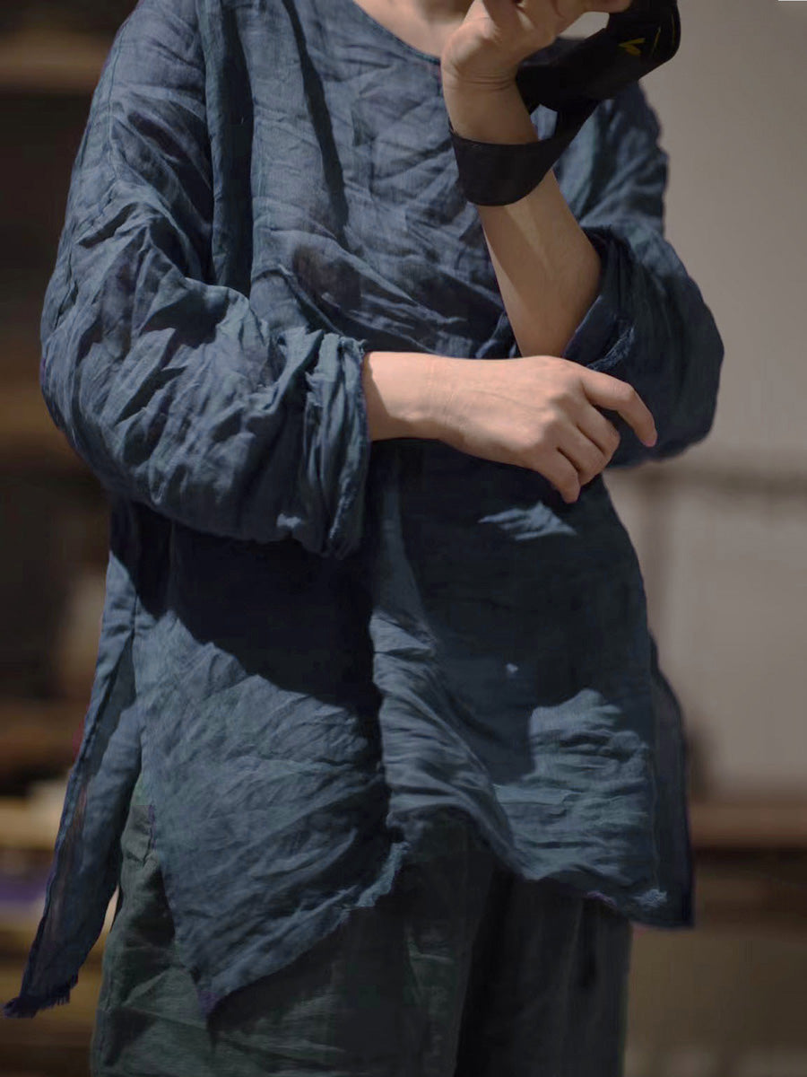 Women Autumn Solid Vintage O-Neck Ramie Blouse