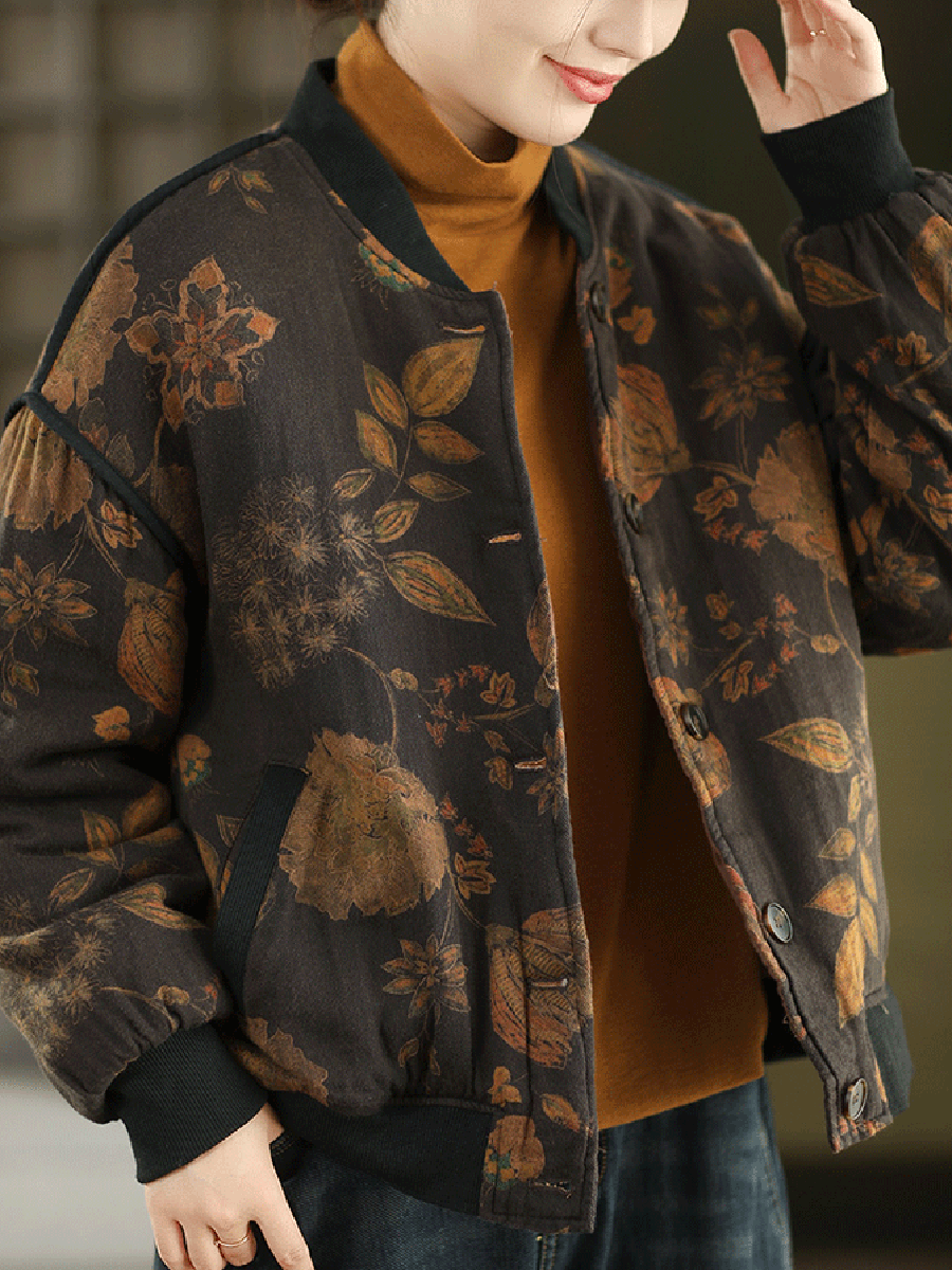 Women Autumn Vintage Flower Stand Collar Cotton Padded Jacket