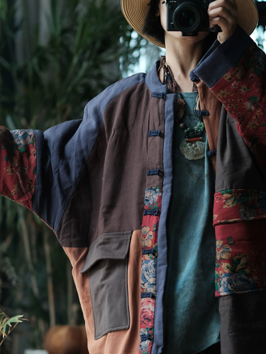 Women Autumn Vintage Patchwork Stand Collar Padded Coat
