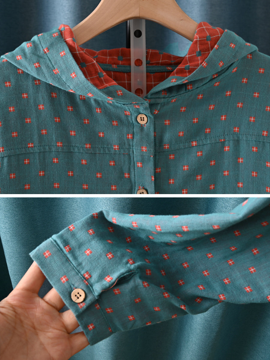 Plus Size Women Autumn Vintage Plaid Hooded 100%Cotton Shirt