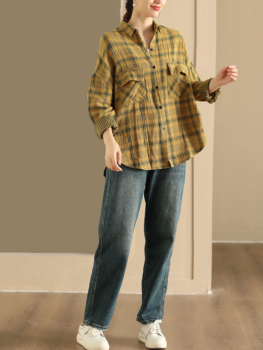 Women Autumn Vintage Plaid Turn-down Collar Shirt