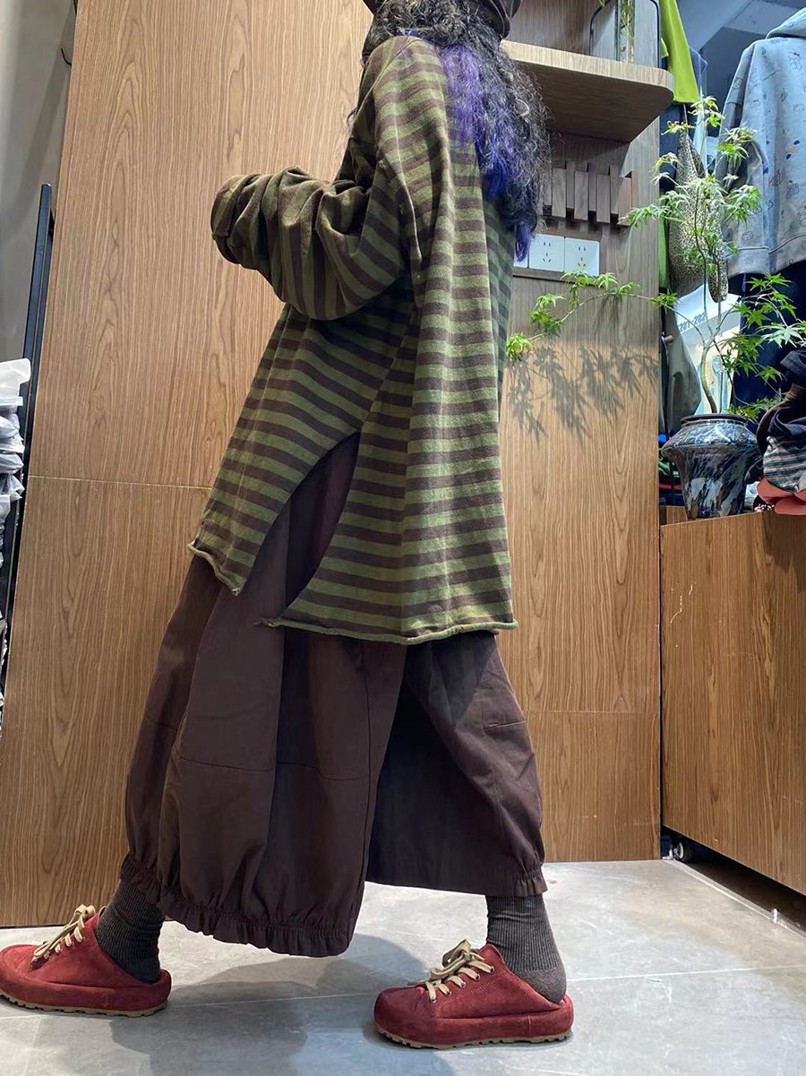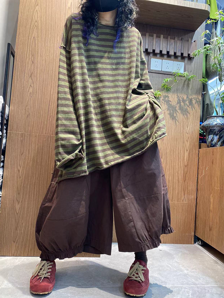 Women Autumn Vintage Stripe 100%Cotton O-Neck Blouse
