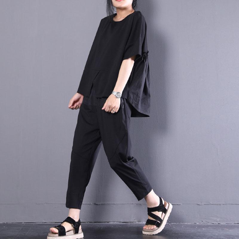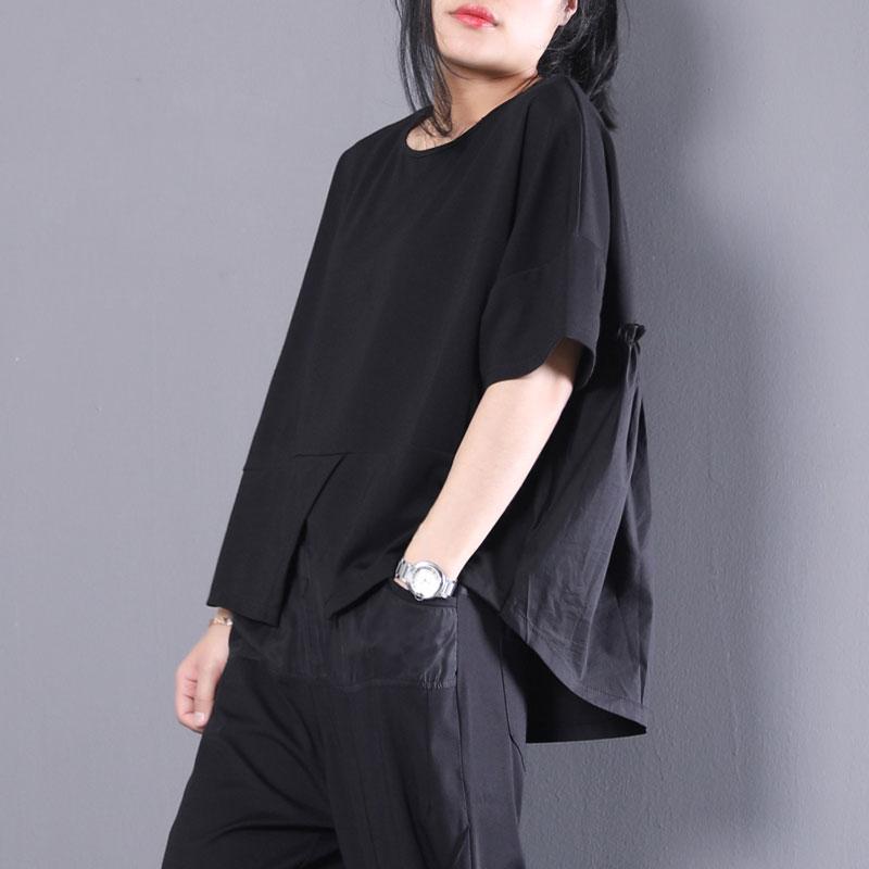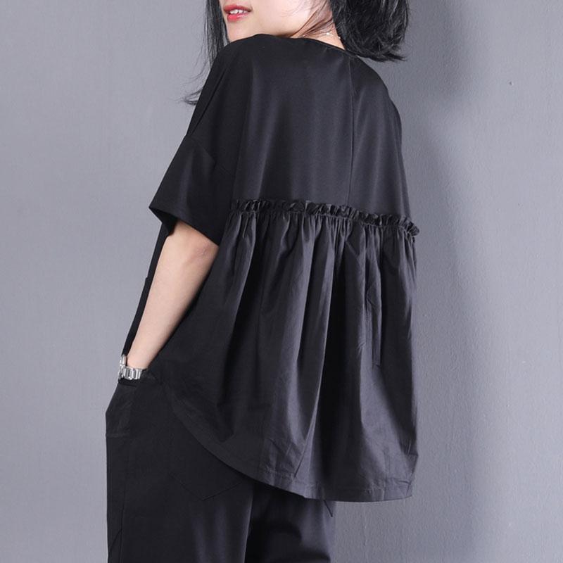 Women Black Cotton Short Sleeve Pleated Loose Tops