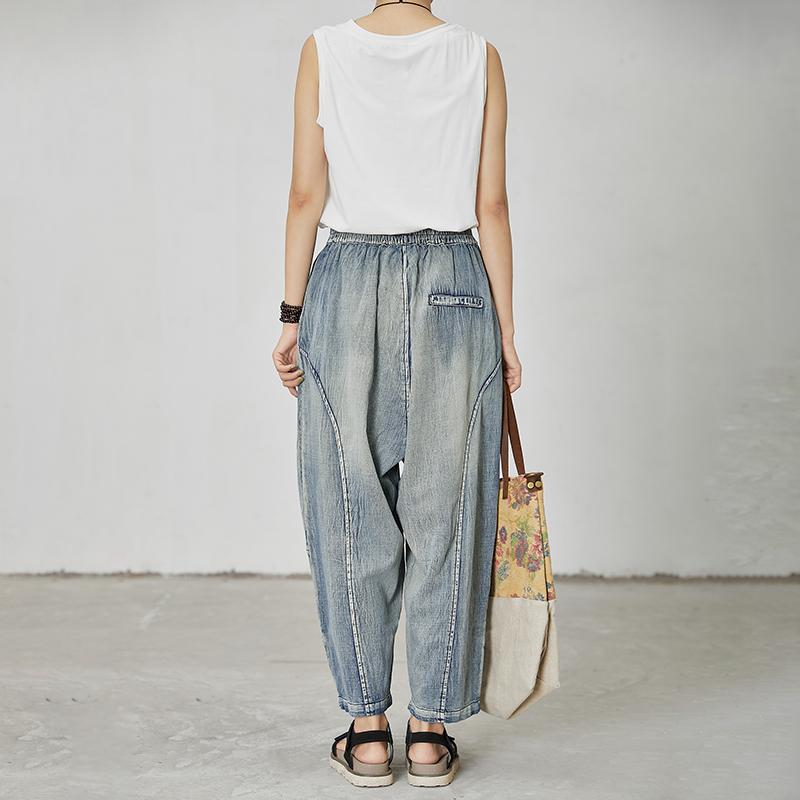 Women Casual Splcied Elastic Waist Pockets Jeans