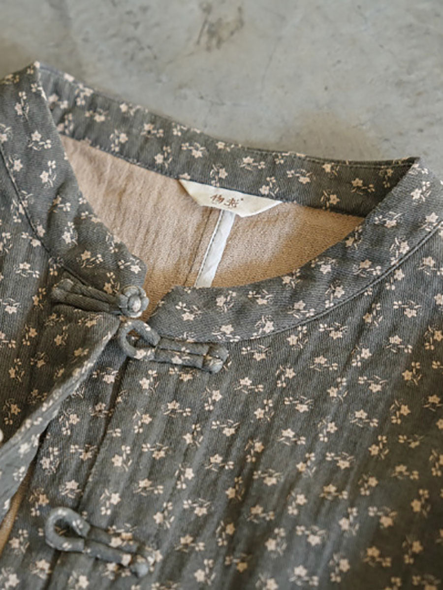 This coat is made of cotton and features a floral pattern. It has a stand collar and raglan style full length sleeves. giving it a vintage look. Perfect for both spring and autumn seasons.