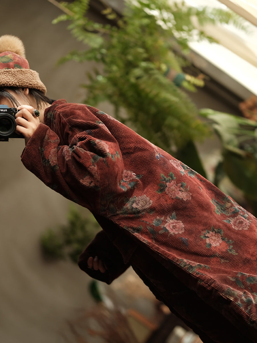 Women Ethnic Flower Corduroy Loose Padded Coat