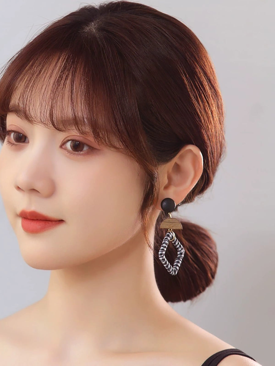 Women Ethnic Wooden Cloth Square S925Silver Earrings